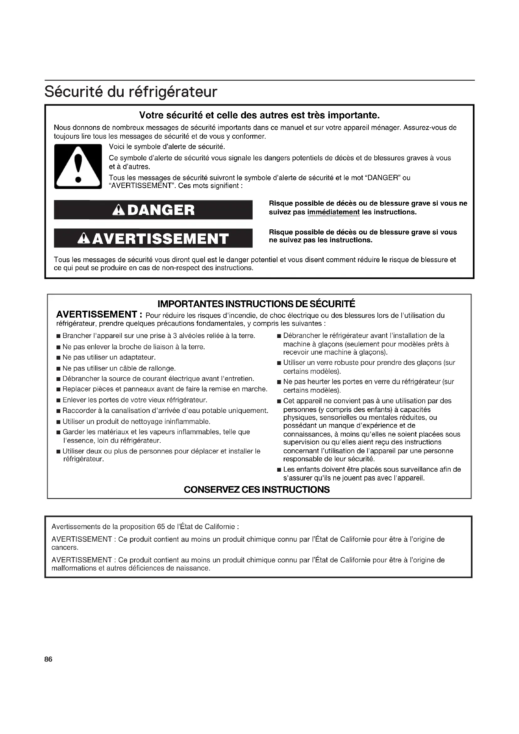 ■ Brancher l'appareil sur une prise à 3 alvéoles reliée à la terre. ■ Ne pas enlever la broche de liaison à la terre.■ Ne pas utiliser un adaptateur.■ Ne pas utiliser un câble de rallonge. ■ Débrancher la source de courant électrique avant l'entretien. ■ Replacer pièces et panneaux avant de faire la remise en marche.■ Enlever les portes de votre vieux réfrigérateur. ■ Raccorder à la canalisation d'arrivée d'eau potable uniquement. ■ Utiliser un produit de nettoyage ininflammable.■ Garder les matériaux et les vapeurs inflammables, telle que l'essence, loin du réfrigérateur. ■ Utiliser deux ou plus de personnes pour déplacer et installer le réfrigérateur.■ Débrancher le réfrigérateur avant l'installation de la machine à glaçons (seulement pour modèles prêts à recevoir une machine à glaçons). ■ Utiliser un verre robuste pour prendre des glaçons (sur certains modèles). ■ Ne pas heurter les portes en verre du réfrigérateur (sur certains modèles).■ Cet appareil ne convient pas à une utilisation par des personnes (y compris des enfants) à capacités physiques, sensorielles ou mentales réduites, ou possédant un manque d'expérience et de connaissances, à moins qu'elles ne soient placées sous supervision ou qu'elles aient reçu des instructions concernant l’utilisation de l'appareil par une personne responsable de leur sécurité. ■ Les enfants doivent être placés sous surveillance afin de s'assurer qu'ils ne jouent pas avec l'appareil. Avertissements de la proposition 65 de l'État de Californie :