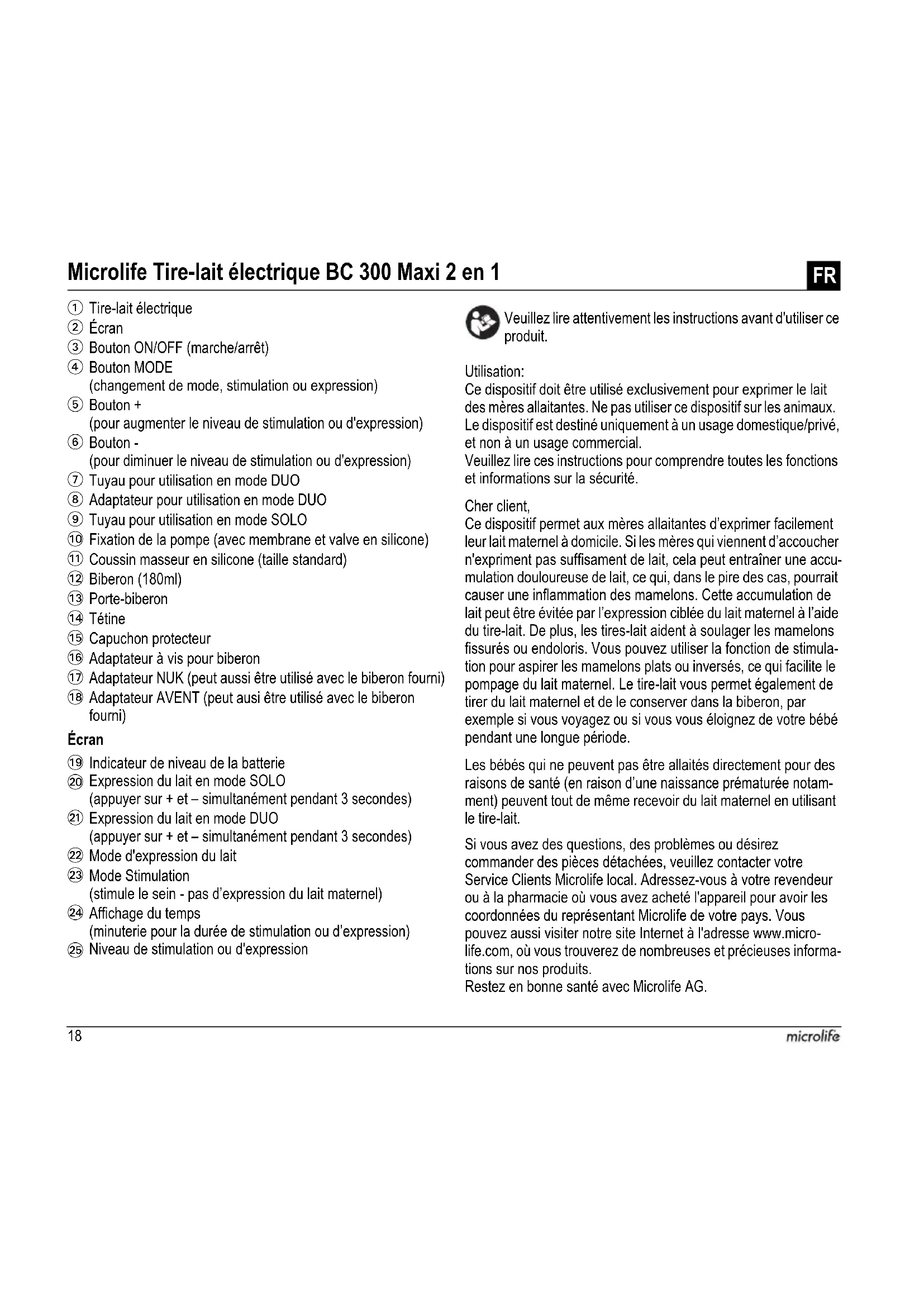 Conexión eléc- trica: 4 baterías alcalinas 1,5 V; tamaño AA Adaptador de corriente: Entrada: 100-240VAC 50/60Hz 0,5A Salida: 6V DC 1.0 AA Duración de la batería: 500 horas Clase IP: IP21 Vida útil espe- rada: 500 horas Limites de funciona- miento: 30 min encendido / 30 min apagado Equipo de tipo BF (unidad con grado específico de protec- ción contra riesgos eléctricos). Unidad adecuada para uso en ambientes que no contengas gases oxidantes, gases explosivos ni óxido nitroso.18 Écran Veuillez lire attentivement les instructions avant d'utiliser ce produit. Utilisation: Ce dispositif doit être utilisé exclusivement pour exprimer le lait des mères allaitantes. Ne pas utiliser ce dispositif sur les animaux. Le dispositif est destiné uniquement à un usage domestique/privé, et non à un usage commercial. Veuillez lire ces instructions pour comprendre toutes les fonctions et informations sur la sécurité. Cher client, Ce dispositif permet aux mères allaitantes d’exprimer facilement leur lait maternel à domicile. Si les mères qui viennent d’accoucher n'expriment pas suffisament de lait, cela peut entraîner une accu- mulation douloureuse de lait, ce qui, dans le pire des cas, pourrait causer une inflammation des mamelons. Cette accumulation de lait peut être évitée par l’expression ciblée du lait maternel à l’aide du tire-lait. De plus, les tires-lait aident à soulager les mamelons fissurés ou endoloris. Vous pouvez utiliser la fonction de stimula- tion pour aspirer les mamelons plats ou inversés, ce qui facilite le pompage du lait maternel. Le tire-lait vous permet également de tirer du lait maternel et de le conserver dans la biberon, par exemple si vous voyagez ou si vous vous éloignez de votre bébé pendant une longue période. Les bébés qui ne peuvent pas être allaités directement pour des raisons de santé (en raison d’une naissance prématurée notam- ment) peuvent tout de même recevoir du lait maternel en utilisant le tire-lait. Si vous avez des questions, des problèmes ou désirez commander des pièces détachées, veuillez contacter votre Service Clients Microlife local. Adressez-vous à votre revendeur ou à la pharmacie où vous avez acheté l'appareil pour avoir les coordonnées du représentant Microlife de votre pays. Vous pouvez aussi visiter notre site Internet à l'adresse www.micro- life.com, où vous trouverez de nombreuses et précieuses informa- tions sur nos produits. Restez en bonne santé avec Microlife AG. Microlife Tire-lait électrique BC 300 Maxi 2 en 1