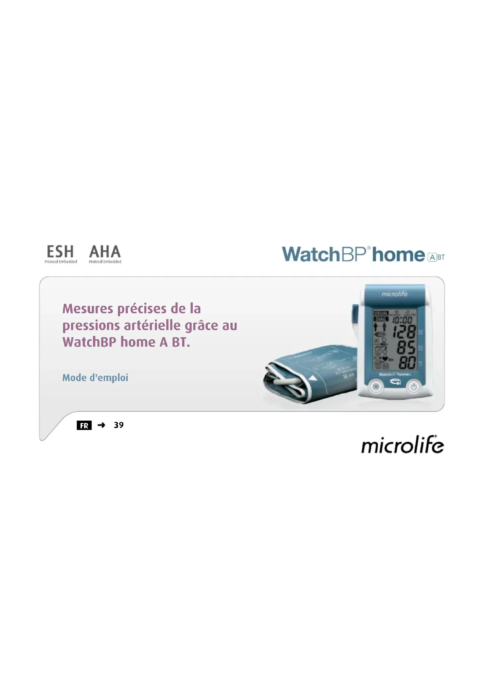Mesures précises de la pressions artérielle grâce au WatchBP home A BT. Mode d'emploi Bluetooth BTMicrolife WatchBP Home A est le premier tensiomètre numérique au monde satisfaisant aux recommandations de la Société européenne d'hypertension (ESH) et de l'Association américaine de cardiologie (AHA). WatchBP Home A BT vous permet d'effectuer des mesures de pression artérielle qui serviront ultérieurement à votre médecin. Cet appareil satisfait aux tests cliniques du protocole ESH