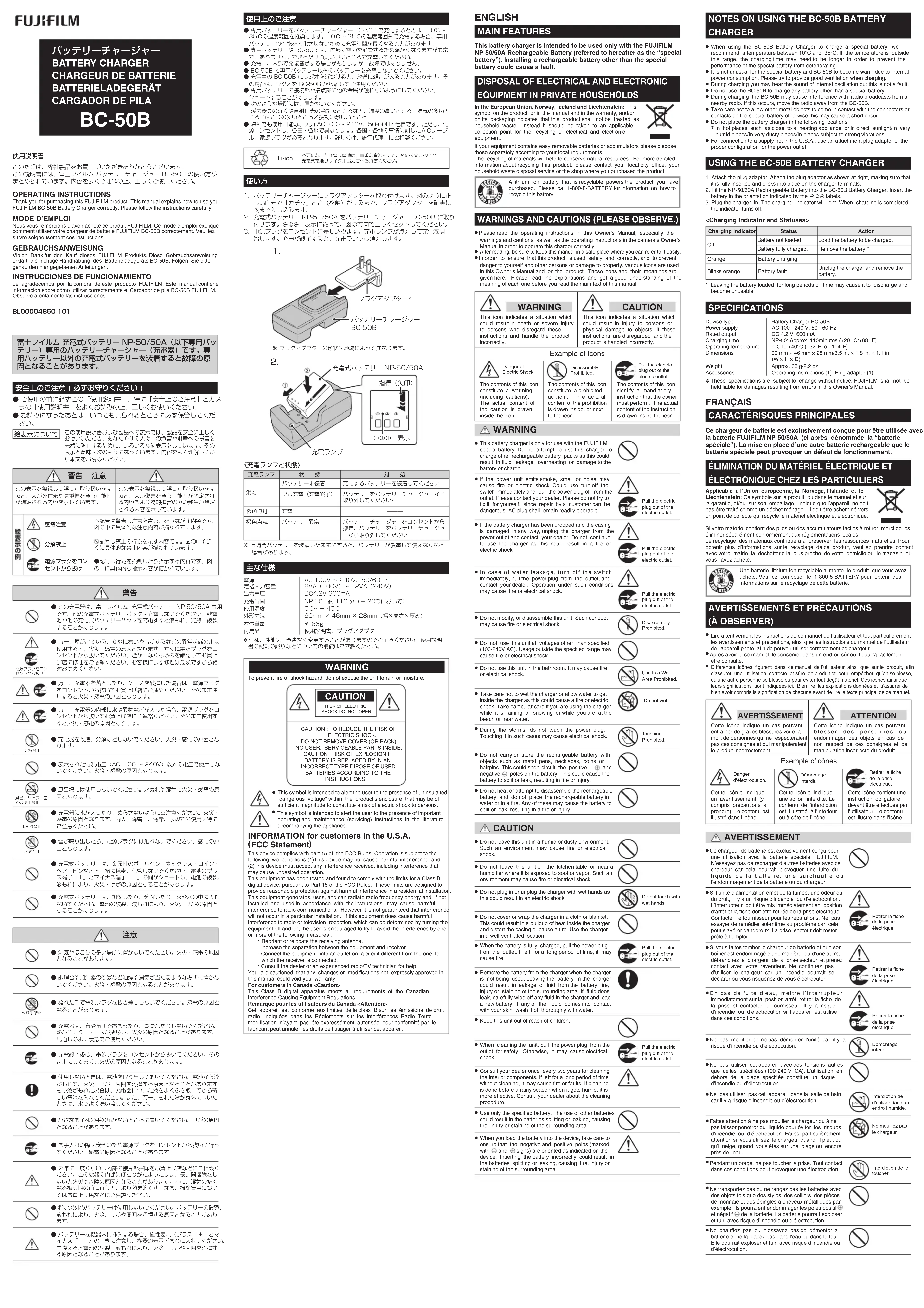 - Laisser la batterie chargée pendant de longues périodes peut entraîner son déchargement et cela peut la rendre inutilisable. SPÉCIFICATIONS Type d’appareil Chargeur de batterie BC-50B Alimentation CA 100 - 240 V, 50 - 60 Hz Sortie nominale 4,2 V c.c., 600 mA Temps de charge NP-50: Environ 110 minutes (+20 °C/+68 °F) Température de service 0°C à +40°C Dimensions 90 mm × 46 mm × 28 mm (L × H × P) Poids Environ 63 g Accessoires Mode d’emploi (1), Fiche intermédiaire (1) ✽ La conception et les spécifications sont susceptibles d’être modifiées sans préavis. FUJIFILM n’acceptera aucune responsabilité à la suite de dégâts éventuels provenant d’erreurs dans ce MODE D’EMPLOI. DEUTSCH BESONDERHEITEN Dieses Batterieladegerät dient nur zur Verwendung für die wi e dera u flad b are Ba t teri e N P-50 / 50A ( n a ch s t ehe n d m it “Spezialbatterie” bezeichnet) von FUJIFILM. Das Einlegen einer anderen wiederaufladbaren Batterie anstelle der Spezialbatterie könnte sich in Störungen auswirken.