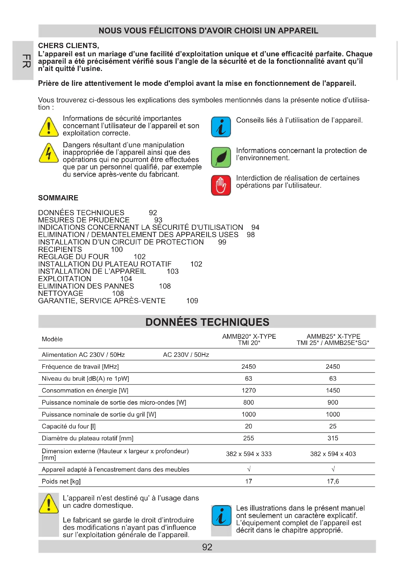 - Richtlinie RoHS 2011/65/EG Das Gerät ist mit dem Zeichen gekennzeichnet und verfügt über eine Konformitätserklärung zur Einsichtnahme durch die zuständigen Marktüberwa- chungsbehörden.92 L’appareilestunmariaged’unefacilitéd’exploitationuniqueetd’uneefcacitéparfaite.Chaqueappareilaétéprécisémentvériésousl’angledelasécuritéetdelafonctionnalitéavantqu’iln’aitquittél’usine.Prièredelireattentivementlemoded'emploiavantlamiseenfonctionnementdel'appareil.CHERSCLIENTS, NOUSVOUSFÉLICITONSD'AVOIRCHOISIUNAPPAREIL Vous trouverez ci-dessous les explications des symboles mentionnés dans la présente notice d’utilisa- tion :Interdiction de réalisation de certaines opérations par l’utilisateur.Dangers résultant d’une manipulation inappropriée de l’appareil ainsi que des opérations qui ne pourront être effectuées que par un personnel qualié, par exemple du service après-vente du fabricant.L’appareil n’est destiné qu’ à l’usage dans un cadre domestique.Le fabricant se garde le droit d’introduire des modications n’ayant pas d’inuence sur l’exploitation générale de l’appareil.Informations de sécurité importantes concernant l’utilisateur de l’appareil et son exploitation correcte.Conseils liés à l’utilisation de l’appareil.