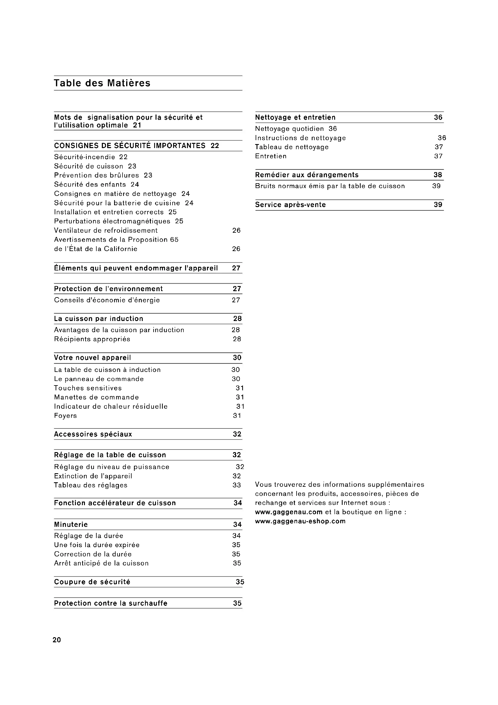 Sécurité-incendie 22 Sécurité de cuisson 23 Prévention des brûlures 23 Sécurité des enfants 24 Consignes en matière de nettoyage 24 Sécurité pour la batterie de cuisine 24 Installation et entretien corrects 25 Perturbations électromagnétiques 25 Ventilateur de refroidissement 26 Avertissements de la Proposition 65 de l’État de la Californie 26 Éléments qui peuvent endommager l'appareil 27 Protection de l'environnement 27 Conseils d'économie d'énergie 27 La cuisson par induction 28 Avantages de la cuisson par induction 28 Récipients appropriés 28 Votre nouvel appareil 30 La table de cuisson à induction 30 Le panneau de commande 30 Touches sensitives 31 Manettes de commande 31 Indicateur de chaleur résiduelle 31 Foyers 31 Accessoires spéciaux 32 Réglage de la table de cuisson 32 Réglage du niveau de puissance 32 Extinction de l'appareil 32 Tableau des réglages 33 Fonction accélérateur de cuisson 34 Minuterie 34 Réglage de la durée 34 Une fois la durée expirée 35 Correction de la durée 35 Arrêt anticipé de la cuisson 35 Coupure de sécurité 35 Protection contre la surchauffe 35 Nettoyage et entretien 36 Nettoyage quotidien 36 Instructions de nettoyage 36 Tableau de nettoyage 37 Entretien 37 Remédier aux dérangements 38 Bruits normaux émis par la table de cuisson 39 Service après-vente 39 Vous trouverez des informations supplémentaires concernant les produits, accessoires, pièces de rechange et services sur Internet sous : www.gaggenau.com et la boutique en ligne : www.gaggenau-eshop.com21 Mots de signalisation pour la sécurité et l'utilisation optimale 9 AVERTISSEMENT Le non-respect de cet avertissement peut entraîner la mort ou des blessures graves. 9 ATTENTION Le non-respect de cet avertissement peut entraîner des blessures mineures ou modérées. AVIS : Vous indique que des dommages à l'appareil ou aux biens peuvent survenir si vous ne respectez pas cet avertissement. Remarque : Vous signale des informations importantes ou des conseils.22