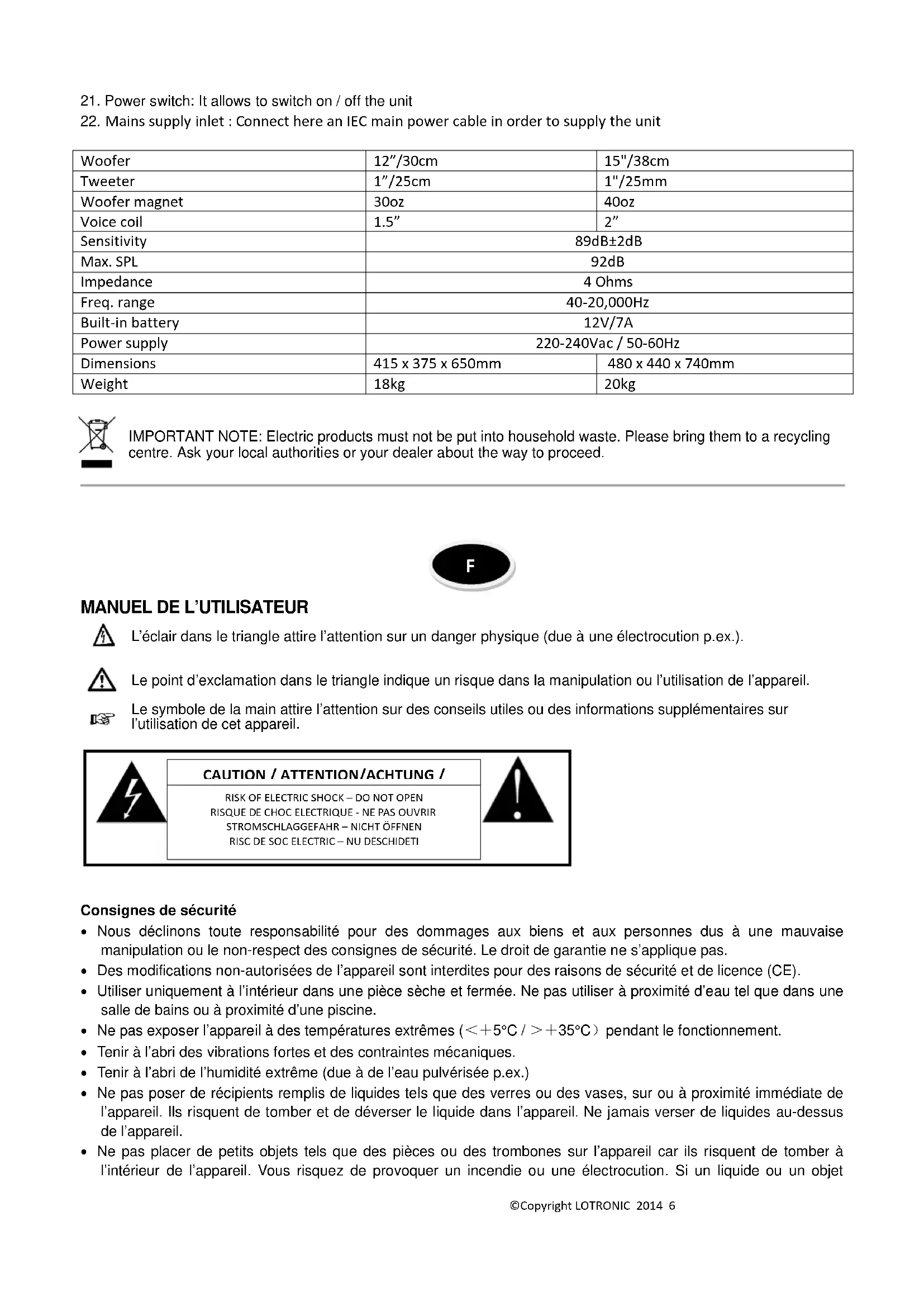 - Dispositifs de coupure du réseau a) lorsque le cordon d'alimentation ou un coupleur d'appareil est utilisé comme dispositif de déconnexion, ce dispositif doit rester facilement accessible; b) Si un interrupteur omnipolaire est utilisé comme dispositif de déconnexion, l'emplacement sur l'appareil et la fonction de l'interrupteur doit être décrite, et le commutateur doit rester facilement accessible; Restrictions d’usage - Etant donné que le produit intègre un système de transmission et réception de signaux VHF, son usage est exclusivement réservé à un usage professionnel. L’utilisateur du produit assume la pleine responsabilité de l’utilisation qu’il fait du produit. Le metteur sur le marché ne sera en rien responsable d’une mauvaise utilisation faite par le consommateur du produit. - Le symbole ! qui apparaît sur l’émetteur sans fil, le packaging, le manuel et sur le produit signifie que le produit ne peut être utilisé que dans certains pays de l’UE (FR – BE – PT – D – NL – LU – GR – SP – RO). CARACTERISTIQUES - BLUETOOTH - Amplificateur intégré - Lecteur MP3 / WMA intégré - Télécommande - 2 microphones VHF - Fonction VOX©Copyright LOTRONIC 2014 8 - Récepteur VHF à 2 canaux intégré - Réglages des basses & aiguës - Contrôle de volume MICRO & ECHO - Volume général MASTER - Entrées MICRO & LIGNE - Batterie rechargeable intégrée - Trolley et roulettes - Alimentation : 220-240Vac 50/60Hz ALIMENTATION PAR BATTERIE OU PAR LE SECTEUR