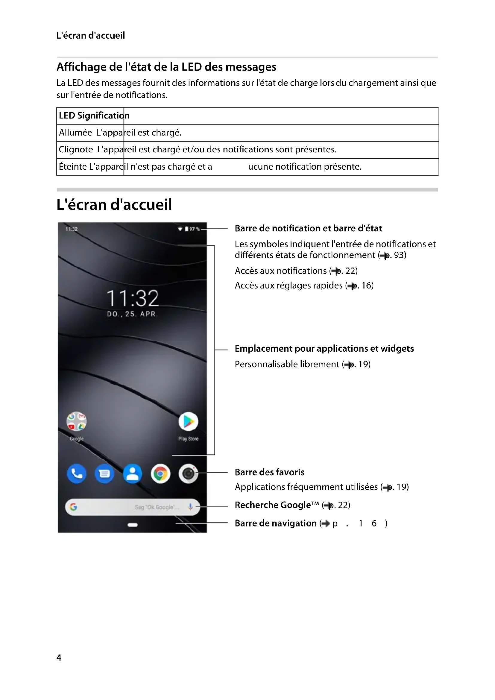 Affichage de l'état de la LED des messages La LED des messages fournit des informations sur l'état de charge lors du chargement ainsi que sur l'entrée de notifications. L'écran d'accueil LED Signification Allumée L'appareil est chargé. Clignote L'appareil est chargé et/ou des notifications sont présentes. Éteinte L'appareil n'est pas chargé et a ucune notification présente. Barre de notification et barre d'état Les symboles indiquent l'entrée de notifications et différents états de fonctionnement ( p. 93) Accès aux notifications ( p. 22) Accès aux réglages rapides ( p. 16) Barre de navigation ( p. 16) Barre des favoris Applications fréquemment utilisées ( p. 19) Emplacement pour applications et widgets Personnalisable librement ( p. 19) Recherche Google