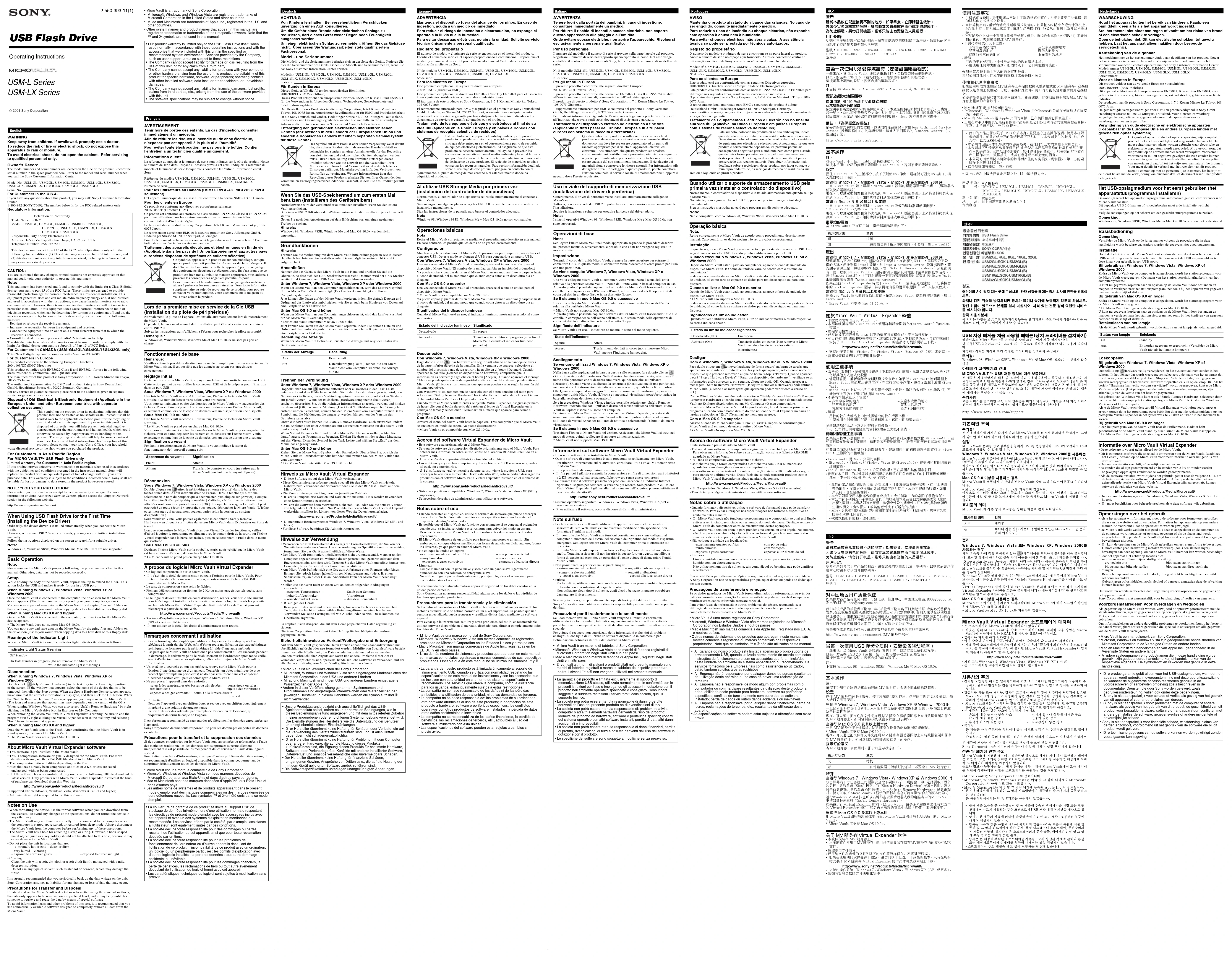 - Lors du formatage du périphérique, utilisez le logiciel de formatage après l’avoirtéléchargé à partir du site Web. Afin d’éviter toute modification des caractéristiquestechniques, ne formatez pas le périphérique à l’aide d’une autre méthode.• Il se peut que le Micro Vault ne fonctionne pas correctement s’il est raccordé pendantle démarrage, le redémarrage ou le rétablissement de l’ordinateur après mode veille.Avant d’effectuer une de ces opérations, débranchez toujours le Micro Vault del’ordinateur.• Un système d’accroche et non pas orifice se trouve sur le Micro Vault pour lafixation d’une dragonne ou d’un anneau. Toutefois, un objet métallique de typecrochet (par exemple un porte-clefs) ne doit pas être inséré dans cet ce sytèmed’accroche orifice car il peut endommager le Micro Vault.• Ne pas placer l’appareil dans des endroits : sujets à des températures très basses ou très élevées ;– poussiéreux ou sales ;– très humides ; – sujets à des vibrations ;– exposés à des gaz corrosifs ; – soumis à la lumière directedu soleil.•EntretienNettoyez l’appareil avec un chiffon doux et sec ou avec un chiffon doux légèrementimprégné d’une solution détergente neutre.Evitez d’utiliser des solvants, par exemple de l’alcool ou de l’essence, quirisqueraient de ternir la coque de l’appareil.Il est fortement recommandé de sauvegarder régulièrement les données enregistrées surl’appareil.Sony Corporation décline toute responsabilité pour les dommages ou pertes de donnéeséventuels.Précautions pour le transfert et la suppression des donnéesSi des données enregistrées sur le Micro Vault sont supprimées ou reformatées à l’aidedes méthodes traditionnelles, les données sont supprimées superficiellementuniquement et il est possible de les récupérer et de les réutiliser à l’aide d’un logicielspécial.Pour éviter toute fuite d’informations, ainsi que d’autres problèmes de même nature, ilest recommandé d’utiliser un logiciel disponible dans le commerce, permettant desupprimer définitivement toutes les données du Micro Vault.• Micro Vault est une marque commerciale de Sony Corporation.• Microsoft, Windows et Windows Vista sont des marques déposées deMicrosoft Corporation aux Etats-Unis et dans d’autres pays ou régions.• Mac et Macintosh sont des marques déposées d’Apple Inc. aux Etats-Unis etdans d’autres pays.• Les autres noms de systèmes et de produits apparaissant dans le présentmode d’emploi sont des marques commerciales ou des marques déposées deleurs détenteurs respectifs. Les symboles ™ et ® ont été omis dans ce moded’emploi.• La couverture de garantie de ce produit se limite au support USB destockage de données lui-même, lors d’une utilisation normale respectantles directives du présent mode d’emploi avec les accessoires inclus aveccet appareil et avec un des systèmes d’exploitation mentionnés ourecommandés. Les services offerts par la société, par exemple l’assistanceà l’utilisateur, sont également limités par ces conditions.• La société décline toute responsabilité pour des dommages ou pertesrésultant de l’utilisation de cet appareil, ainsi que pour toute réclamationdéposée par un tiers.• La société décline toute responsabilité pour : les problèmes defonctionnement de l’ordinateur ou d’autres appareils découlant del’utilisation de ce produit ; l’incompatibilité de ce produit avec un ordinateur,un logiciel ou un périphérique particulier ; les conflits d’exploitation avecd’autres logiciels installés ; la perte de données ; tout autre dommageaccidentel ou inévitable.• La société décline toute responsabilité pour les dommages financiers, laperte de bénéfices, les réclamations de tiers ou tout autre événementdécoulant de l’utilisation du logiciel fourni avec cet appareil.• Les caractéristiques techniques du logiciel sont sujettes à modification sanspréavis.ItalianoAVVERTENZATenere fuori dalla portata dei bambini. In caso di ingestione,consultare immediatamente un medico.Per ridurre il rischio di incendi o scosse elettriche, non esporrequesto apparecchio alla pioggia o all’umidità.Onde evitare scosse elettriche, non aprire l’apparecchio. Rivolgersiesclusivamente a personale qualificato.Per uso personaleIl numero del modello e il numero di serie si trovano nella parte laterale del prodotto.Registrare il numero di serie nell’apposito spazio riportato in basso. Nel caso vengacontattato il centro informazioni utenti Sony, fare riferimento ai numeri di modello e diserie.N. di modello USM1GL, USM2GL, USM4GL, USM8GL, USM16GL, USM32GL,USM1GLX, USM2GLX, USM4GLX, USM8GLX, USM16GLXN. di serie ______________________________Per gli utenti in EuropaIl presente prodotto é conforme alle seguenti direttive Europee:2004/108/EC (Direttiva EMC)Il presente prodotto è conforme alle normative EN55022 Class B e EN55024 relativeall’uso in ambienti residenziali, commerciali e dell’industria leggera.Il produttore di questo prodotto e’ Sony Corporation, 1-7-1 Konan Minato-ku Tokyo,108-0075 Giappone.Il rappresentante autorizzato per EMC e sicurezza del prodotto e’ Sony GermaniaGmbh, Hedelfinger Strasse 61, 70327 Stoccarda, Germania.Per qualsiasi informazione riguardante l’assistenza o la garanzia potete far riferimentoall’indirizzo che trovate sugli stessi documenti di assistenza e garanzia.Trattamento del dispositivo elettrico od elettronico a fine vita(applicabile in tutti i paesi dell’Unione Europea e in altri paesieuropei con sistema di raccolta differenziata)Questo simbolo sul prodotto o sulla confezione indica che ilprodotto non deve essere considerato come un normale rifiutodomestico, ma deve invece essere consegnato ad un punto diraccolta appropriato per il riciclo di apparecchi elettrici edelettronici. Assicurandovi che questo prodotto sia smaltitocorrettamen