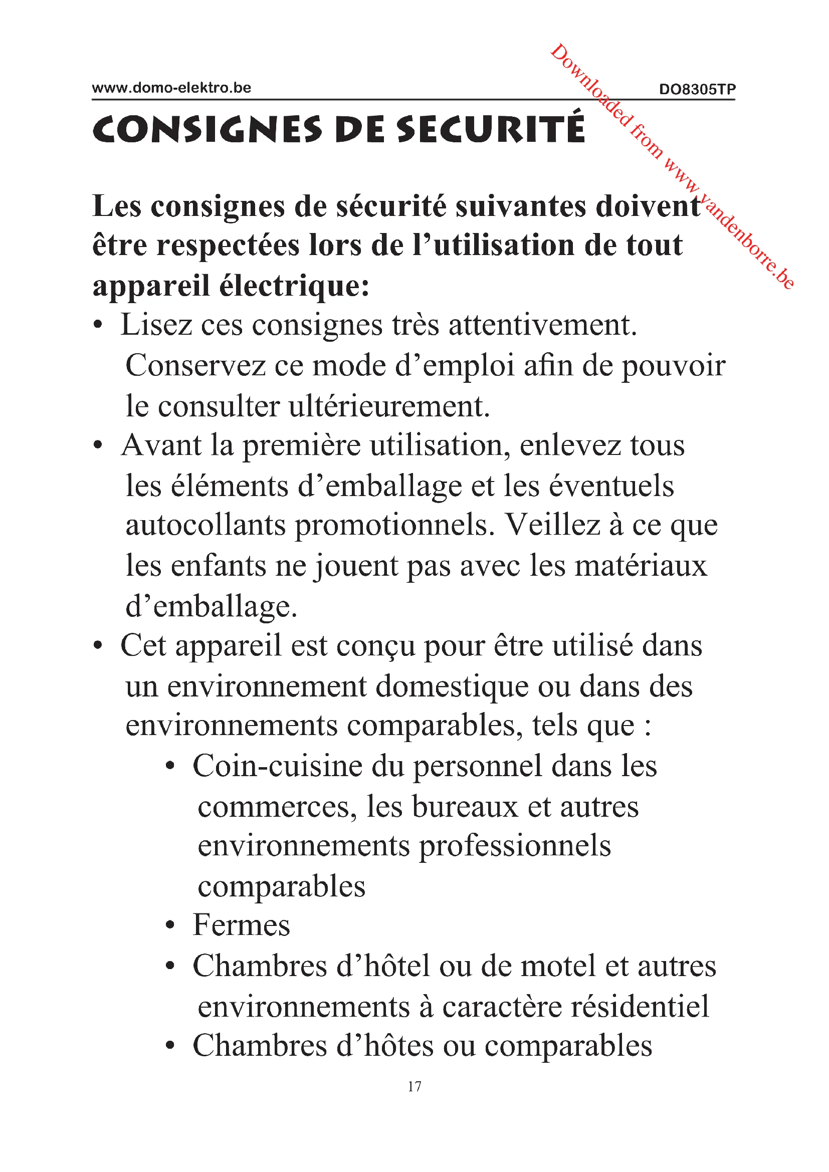 - N’immergez jamais l’appareil, le cordon d’alimentation ou la che dans l’eau ou tout autre liquide. Ceci an d’éviter des chocs électriques ou un incendie. Downloaded from www.vandenborre.beDO8305TP www.domo-elektro.be