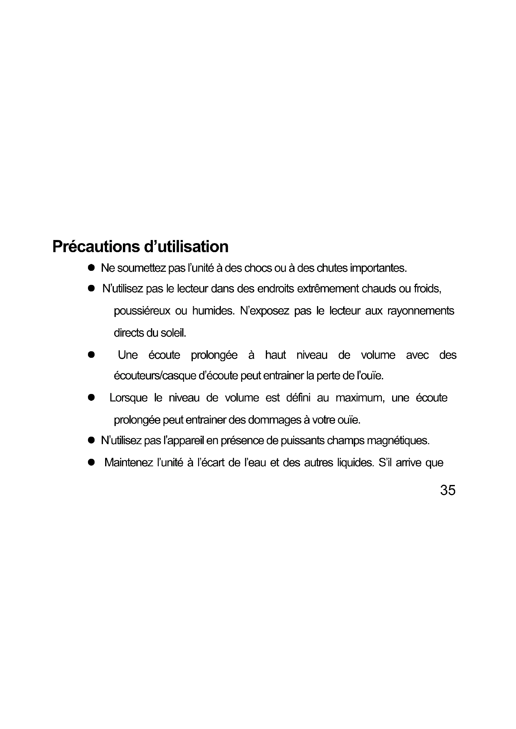 standard to compress30 the player does not support. the unsupported MP3 files. The file format is not supported. Make sure the video is in AVI format. If not, use the provided converting tool to convert it. The video cannot be played. The video data is corrupted Skip it or reload another file The photo cannot be displayed The file format is not supported Try to use an image editor to convert it or save it as another file.31 The image resolution is beyond limitation of the device. The device supports a maximum resolution of 2048 X 2048. Make sure resolution of the image does not excess this limitation. The TXT file cannot be read The file format is not supported. Skip it or reload another file.32 17 Technical Specifications Item Specification Capacity 2GB Battery Type Rechargeable Lithium Battery Battery Life 8 – 10 Hours(only for MP3) or About 4Hours(AVI VIDEO) LCD Display 1.5-inch CSTN screen Earphone Power 5mW+5Mw Video Format AVI (XviD) Audio Format MP3, WMA Photo Format JPEG33 Image Resolution 2048 X 2048 (Max.) Bit Rate MP3: 8-320kbps; WMA: 64-384kbps SNR >90dB USB Port USB2.0 Operational Temperature 0℃ ~ +55℃ Storage Temperature -20℃ ~ +55℃ Operational Relative Humidity * 20% ~ 90% (40℃) Storage Relative Humidity 20% ~ 93% (40℃)34 18 Notice z Make sure all keys are enabled before operation. If they are locked, hold down the MENU and VOL- button to unlock them. z Please charge the battery immediately when the display indicates low battery, or the device will be powered off automatically. z Please disconnect the player from PC properly to avoid data loss. z The transfer rate displayed on the PC may be different depending on the operating system. Exact transfer rate should be subject to the player's indication.35 Précautions d’utilisation z Ne soumettez pas l’unité à des chocs ou à des chutes importantes. z N’utilisez pas le lecteur dans des endroits extrêmement chauds ou froids, poussiéreux ou humides. N’exposez pas le lecteur aux rayonnements directs du soleil. z Une écoute prolongée à haut niveau de volume avec des écouteurs/casque d’écoute peut entrainer la perte de l’ouïe. z Lorsque le niveau de volume est défini au maximum, une écoute prolongée peut entrainer des dommages à votre ouïe. z N’utilisez pas l’appareil en présence de puissants champs magnétiques. z Maintenez l’unité à l’écart de l’eau et des autres liquides. S’il arrive que36 l’unité entre en contact avec de l’eau ou tout autre liquide, éteignez le produit immédiatement et nettoyez-le. z Afin de prévenir toute corrosion, n’utilisez pas de produits chimiques pour nettoyer l’unité. Nettoyez celle-ci avec un chiffon sec. z Nous ne sommes en aucun cas responsables des dommages causés par un dysfonctionnement, utilisation incorrecte, réparation de l’unité ou remplacement de la batterie. z Ne tentez pas de désassembler, réparer ou modifier le produit. Ceci annulera la garantie. z La conception du lecteur et son aspect extérieur peuvent différer du manuel. L’aspect/conception du produit réel prévaut.37 1 Fonctionnalités principales z Lecteur MP3&WMA z Lecteur vidéo AVI z Visualisation d’images JPEG z Navigation de répertoires z Enregistreur de sons z Périphérique de stockage amovible z Batterie lithium-ion rechargeable intégrée z Réglages personnalisés38 2 Configuration système requise z Matériel: ordinateur IBM & ordinateur compatible, ordinateur portable disposant d’un connecteur USB z Systèmes d’exploitation : Windows98/SE, Windows Me, Windows2000/XP, Windows Vista 3 Contenu de l’emballage z Unité z Ecouteurs stéréo z Cordon USB z Manuel d’utilisation z CD avec convertisseur vidéo39 4 Avant toute utilisation