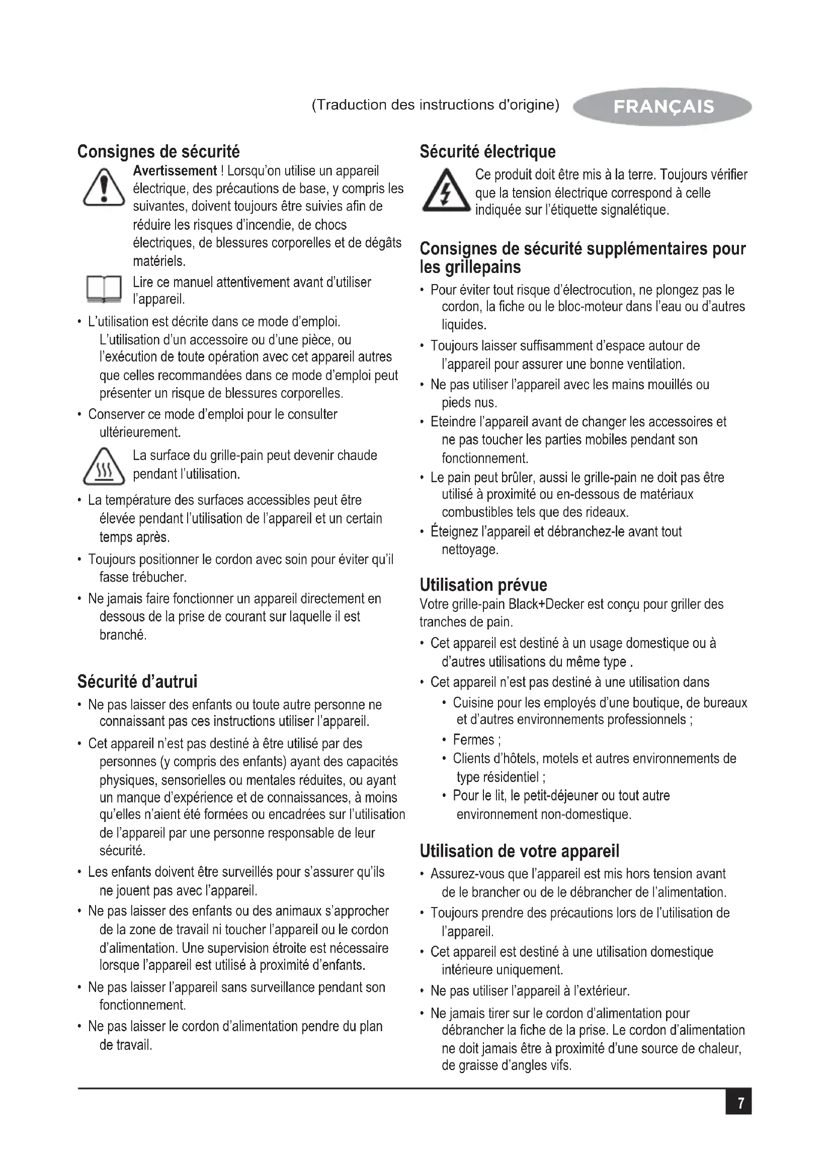 - Éteignez l’appareil et débranchez-le avant tout nettoyage. Utilisation prévue Votre grille-pain Black+Decker est conçu pour griller des tranches de pain.