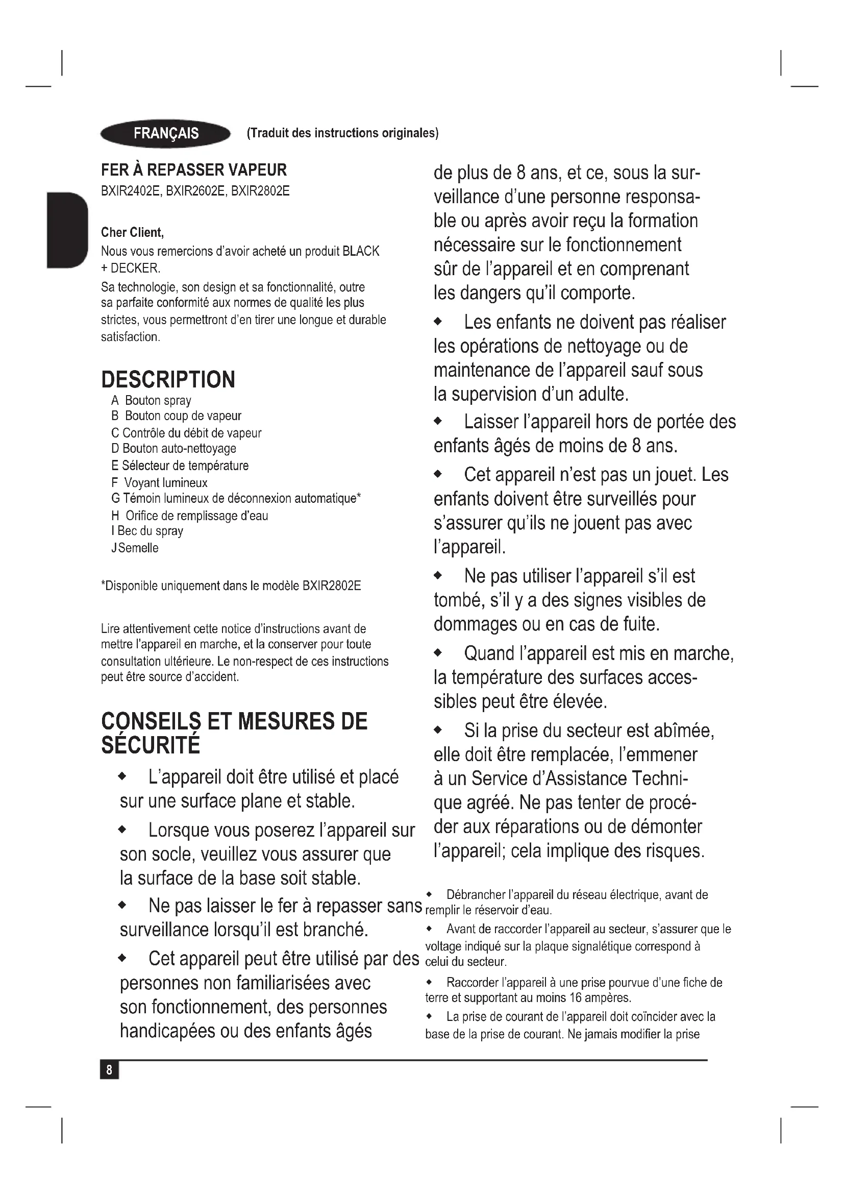 Cher Client, Nous vous remercions d’avoir acheté un produit BLACK + DECKER. Sa technologie, son design et sa fonctionnalité, outre sa parfaite conformité aux normes de qualité les plus strictes, vous permettront d’en tirer une longue et durable satisfaction. DESCRIPTION A Bouton spray B Bouton coup de vapeur C Contrôle du débit de vapeur D Bouton auto-nettoyage E Sélecteur de température F Voyant lumineux G Témoin lumineux de déconnexion automatique* H Orice de remplissage d’eau I Bec du spray J Semelle *Disponible uniquement dans le modèle BXIR2802E Lire attentivement cette notice d’instructions avant de mettre l’appareil en marche, et la conserver pour toute consultation ultérieure. Le non-respect de ces instructions peut être source d’accident.