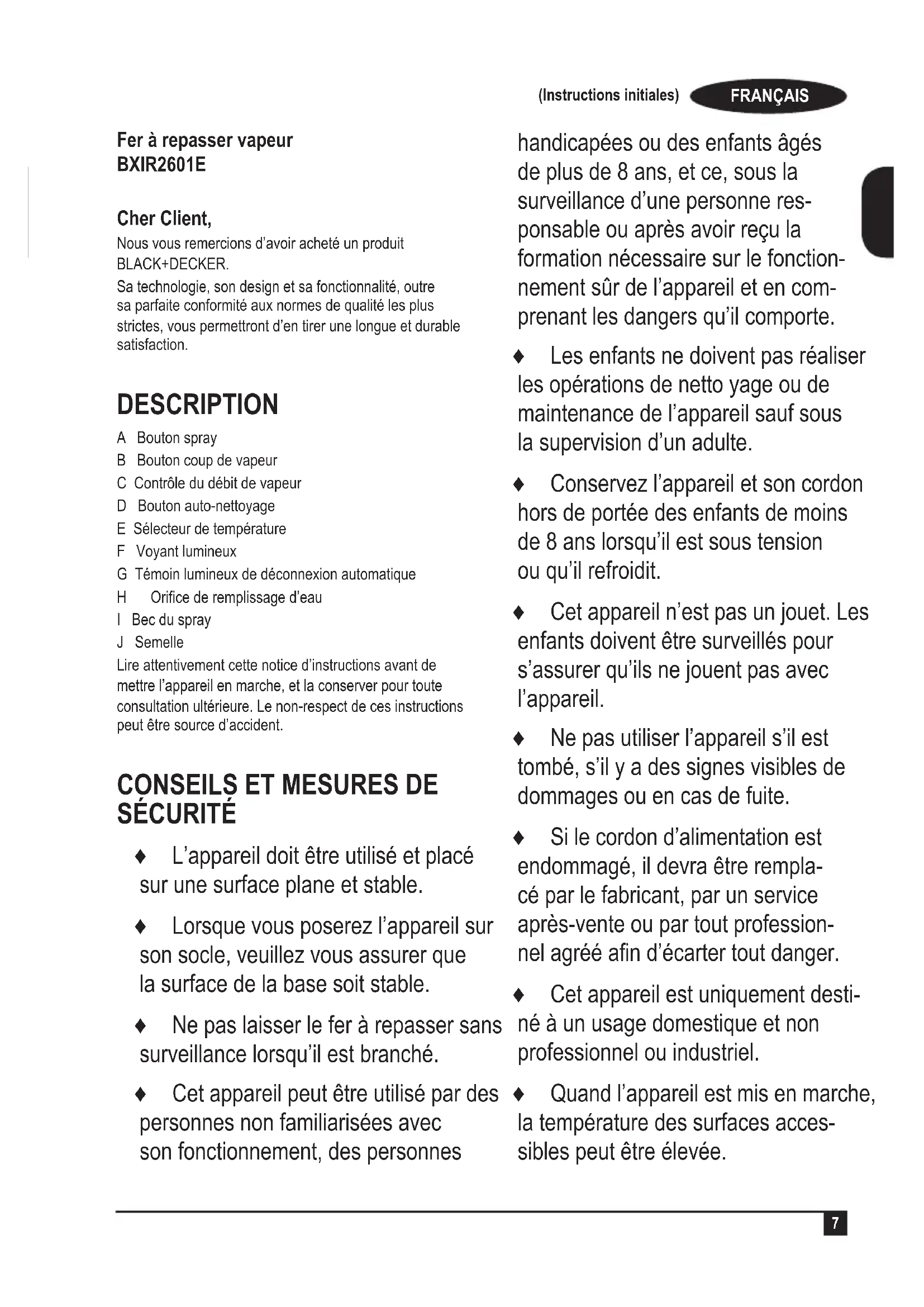 Fer à repasser vapeur BXIR2601E Cher Client, Nous vous remercions d’avoir acheté un produit BLACK+DECKER. Sa technologie, son design et sa fonctionnalité, outre sa parfaite conformité aux normes de qualité les plus strictes, vous permettront d’en tirer une longue et durable satisfaction. DESCRIPTION A Bouton spray B Bouton coup de vapeur C Contrôle du débit de vapeur D Bouton auto-nettoyage E Sélecteur de température F Voyant lumineux G Témoin lumineux de déconnexion automatique H Oricederemplissaged’eau I Bec du spray J Semelle Lire attentivement cette notice d’instructions avant de mettre l’appareil en marche, et la conserver pour toute consultation ultérieure. Le non-respect de ces instructions peut être source d’accident.