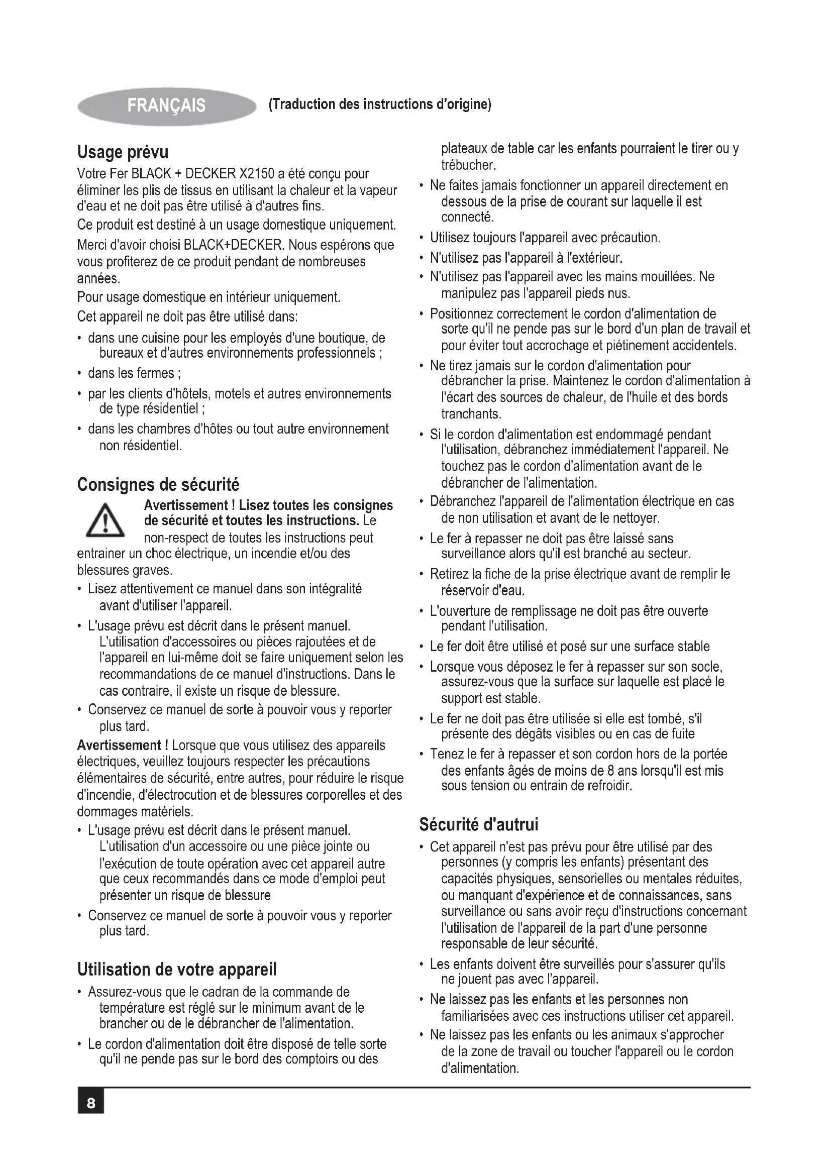 FRANÇAIS (Traduction des instructions d'origine) Usage prévu Votre Fer BLACK + DECKER X2150 a été conçu pour éliminer les plis de tissus en utilisant la chaleur et la vapeur d'eau et ne doit pas être utilisé à d'autres fins. Ce produit est destiné à un usage domestique uniquement. Merci d'avoir choisi BLACK+DECKER. Nous espérons que vous profiterez de ce produit pendant de nombreuses années. Pour usage domestique en intérieur uniquement. Cet appareil ne doit pas être utilisé dans: