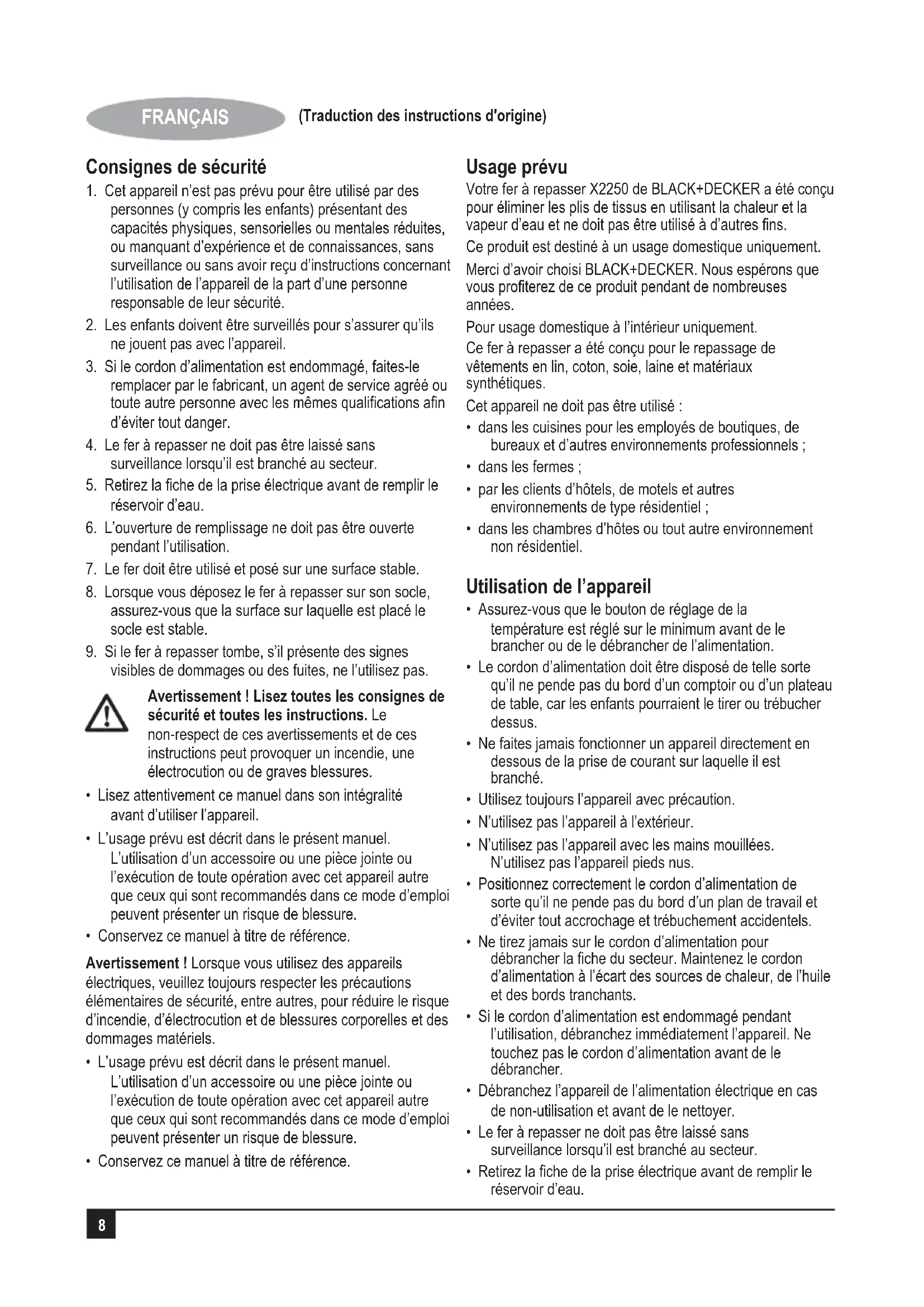 - Conservez ce manuel à titre de référence. Usage prévu Votre fer à repasser X2250 de BLACK+DECKER a été conçu pour éliminer les plis de tissus en utilisant la chaleur et la vapeur d’eau et ne doit pas être utilisé à d’autres fins. Ce produit est destiné à un usage domestique uniquement. Merci d’avoir choisi BLACK+DECKER. Nous espérons que vous profiterez de ce produit pendant de nombreuses années. Pour usage domestique à l’intérieur uniquement. Ce fer à repasser a été conçu pour le repassage de vêtements en lin, coton, soie, laine et matériaux synthétiques. Cet appareil ne doit pas être utilisé :