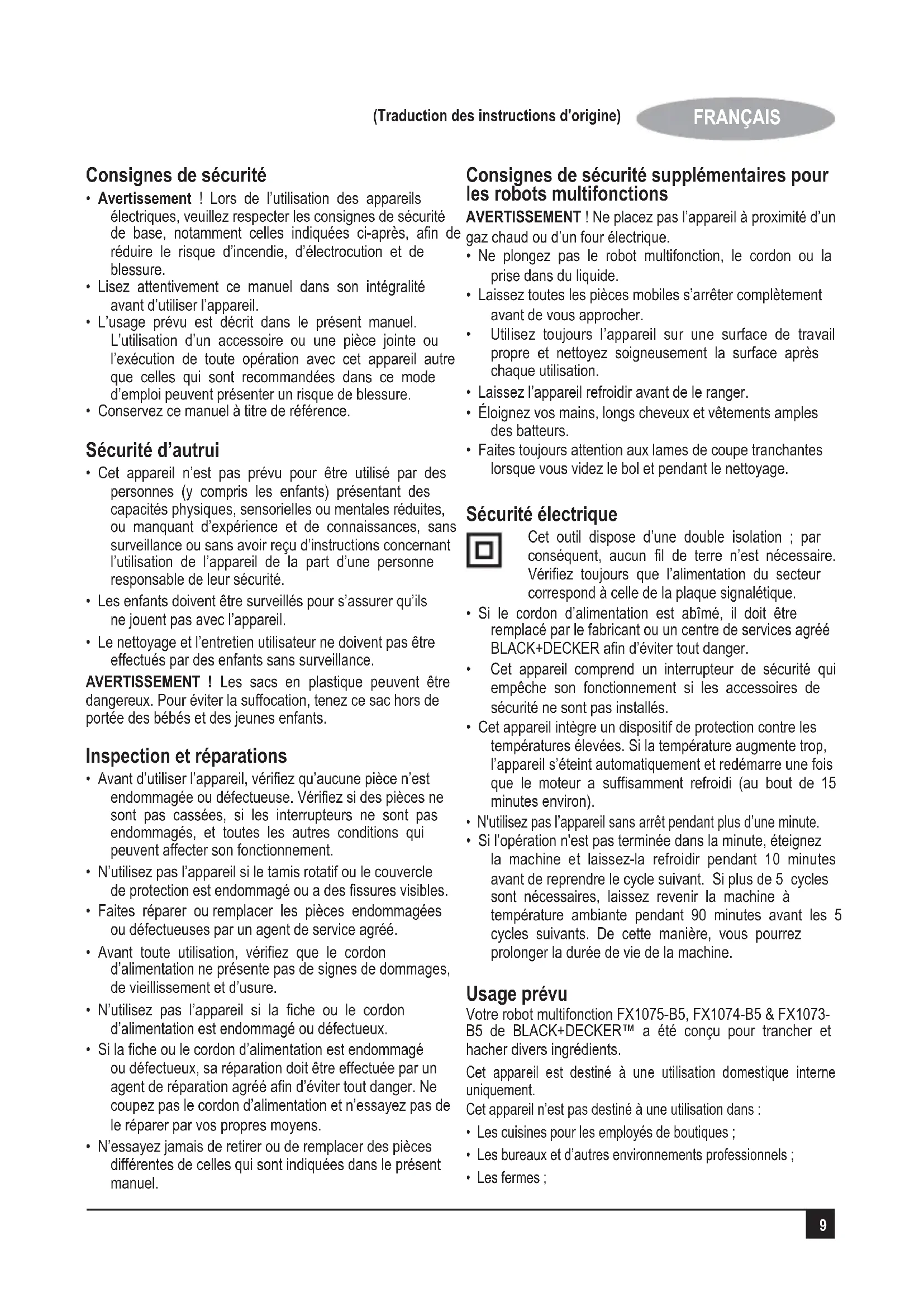 - Si l’opération n'est pas terminée dans la minute, éteignez la machine et laissez-la refroidir pendant 10 minutes avant de reprendre le cycle suivant. Si plus de 5 cycles sont nécessaires, laissez revenir la machine à température ambiante pendant 90 minutes avant les 5 cycles suivants. De cette manière, vous pourrez prolonger la durée de vie de la machine. Usage prévu Votre robot multifonction FX1075-B5, FX1074-B5 & FX1073- B5 de BLACK+DECKER™ a été conçu pour trancher et hacher divers ingrédients. Cet appareil est destiné à une utilisation domestique interne uniquement. Cet appareil n’est pas destiné à une utilisation dans :