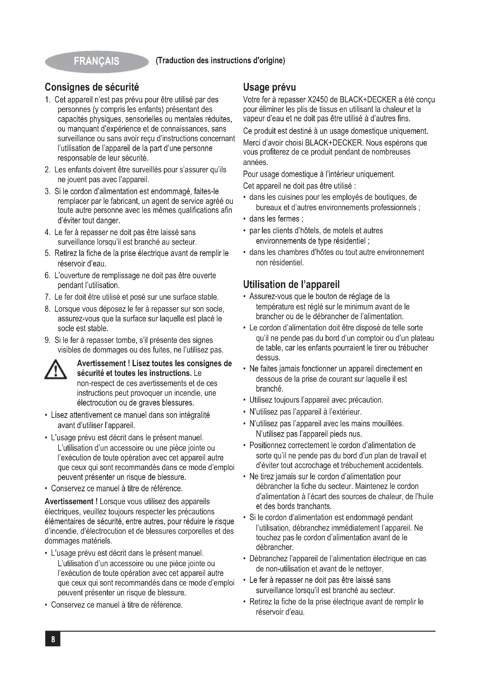 - Conservez ce manuel à titre de référence. Usage prévu Votre fer à repasser X2450 de BLACK+DECKER a été conçu pour éliminer les plis de tissus en utilisant la chaleur et la vapeur d’eau et ne doit pas être utilisé à d’autres fins. Ce produit est destiné à un usage domestique uniquement. Merci d’avoir choisi BLACK+DECKER. Nous espérons que vous profiterez de ce produit pendant de nombreuses années. Pour usage domestique à l’intérieur uniquement. Cet appareil ne doit pas être utilisé :