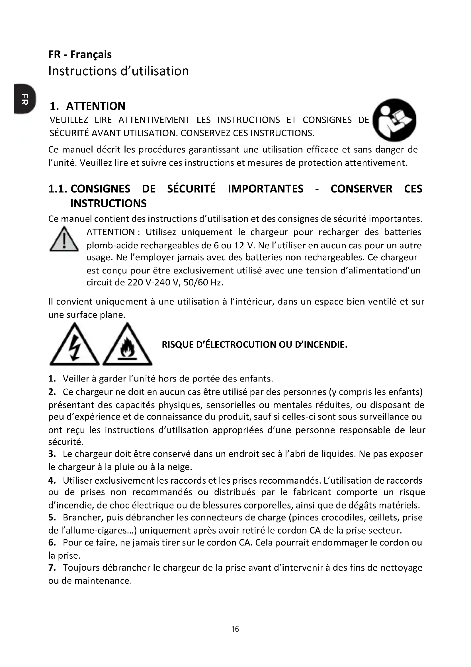 Ce manuel décrit les procédures garantissant une utilisation efficace et sans danger de l’unité. Veuillez lire et suivre ces instructions et mesures de protection attentivement. 1.1. CONSIGNES DE SÉCURITÉ IMPORTANTES - CONSERVER CES INSTRUCTIONS Ce manuel contient des instructions d’utilisation et des consignes de sécurité importantes. ATTENTION : Utilisez uniquement le chargeur pour recharger des batteries plomb-acide rechargeables de 6 ou 12