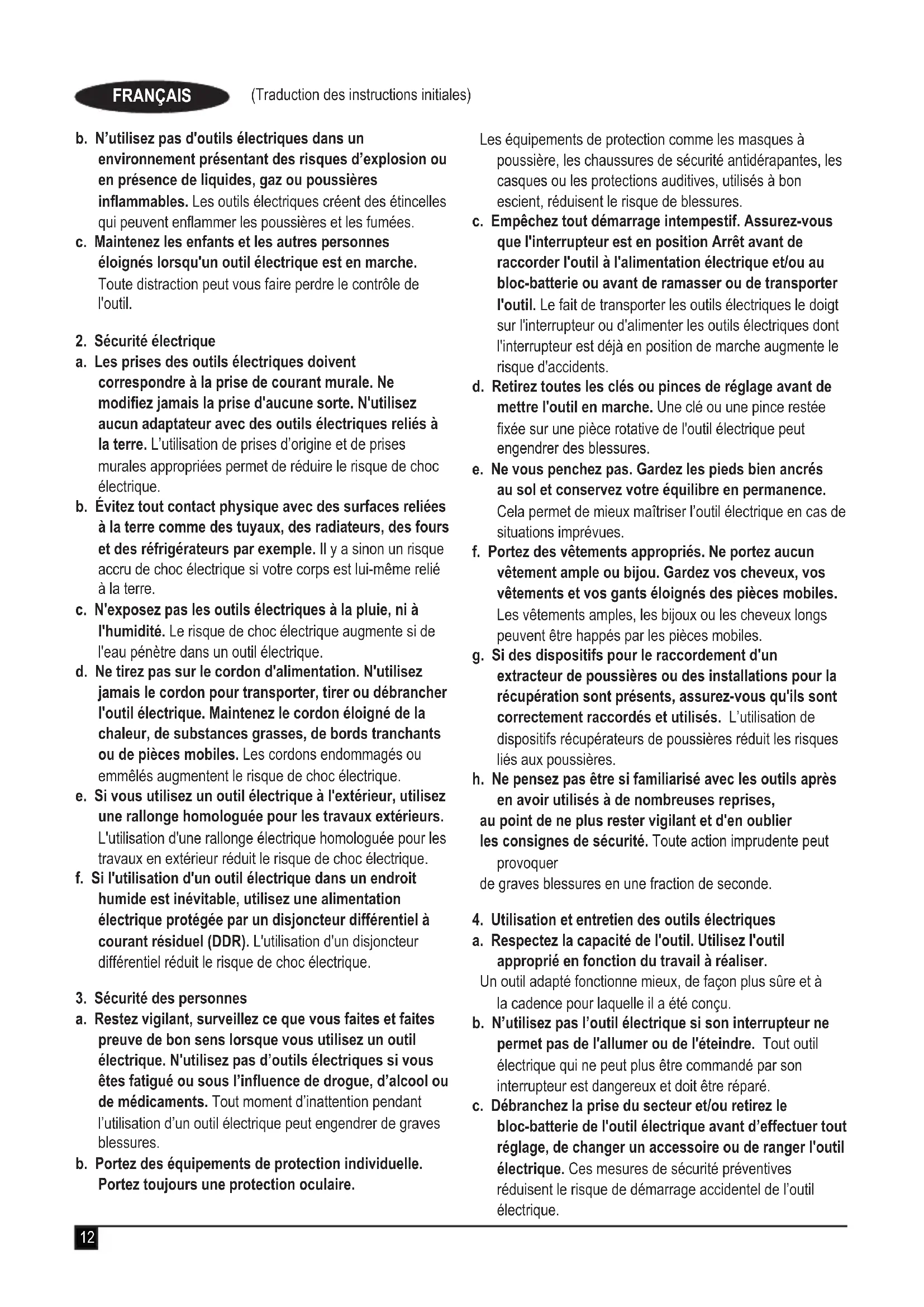 a. Maintenez la zone de travail propre et bien éclairée. Les zones sombres ou encombrées sont propices aux accidents.12 (Traduction des instructions initiales) FRANÇAIS b. N’utilisez pas d'outils électriques dans un environnement présentant des risques d’explosion ou en présence de liquides, gaz ou poussières inammables. Les outils électriques créent des étincelles qui peuvent enammer les poussières et les fumées. c. Maintenez les enfants et les autres personnes éloignés lorsqu'un outil électrique est en marche. Toute distraction peut vous faire perdre le contrôle de l'outil.