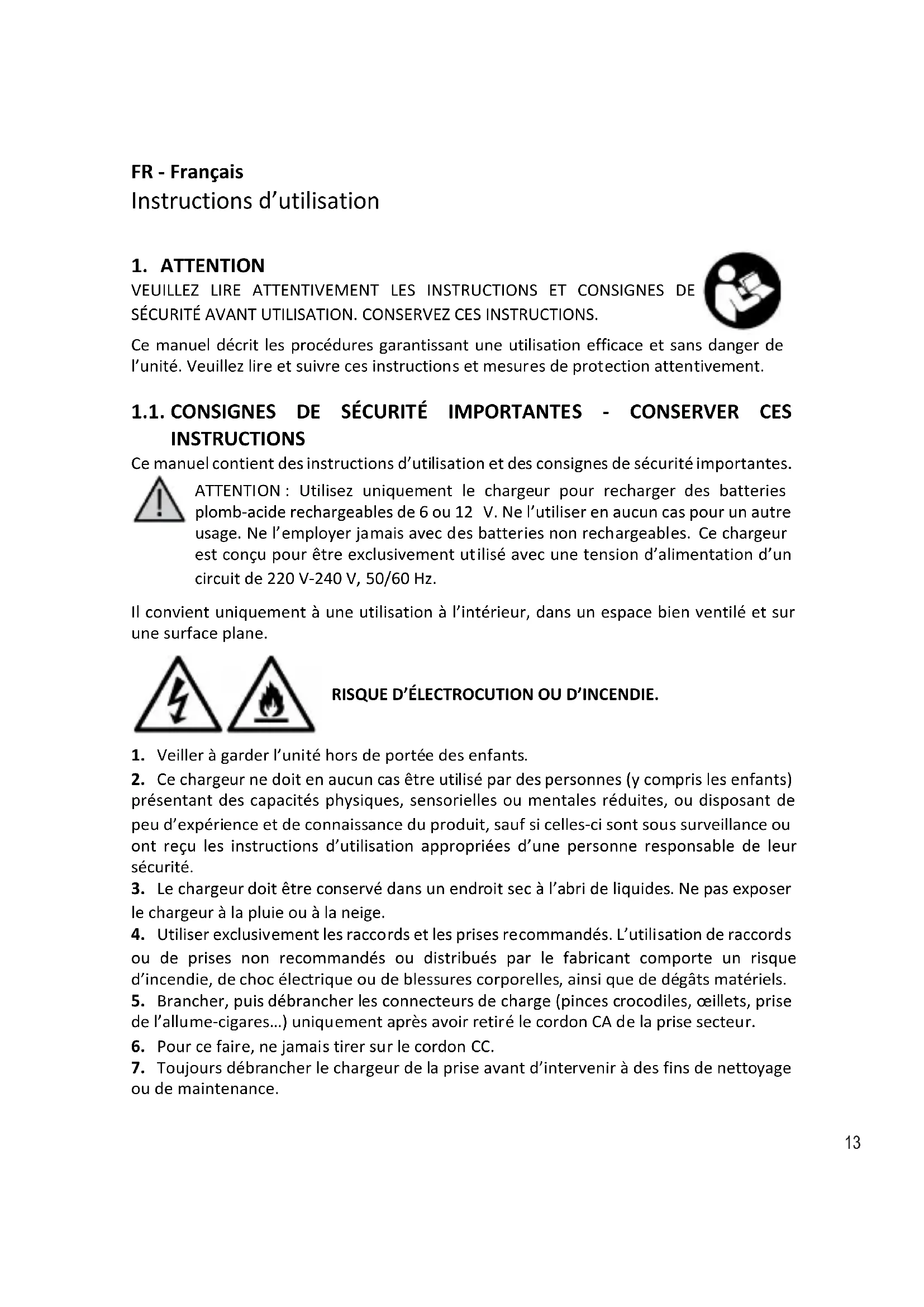 Ce manuel décrit les procédures garantissant une utilisation efficace et sans danger de l’unité. Veuillez lire et suivre ces instructions et mesures de protection attentivement. 1.1. CONSIGNES DE SÉCURITÉ IMPORTANTES - CONSERVER CES INSTRUCTIONS Ce manuel contient des instructions d’utilisation et des consignes de sécurité importantes. ATTENTION : Utilisez uniquement le chargeur pour recharger des batteries plomb-acide rechargeables de 6 ou 12
