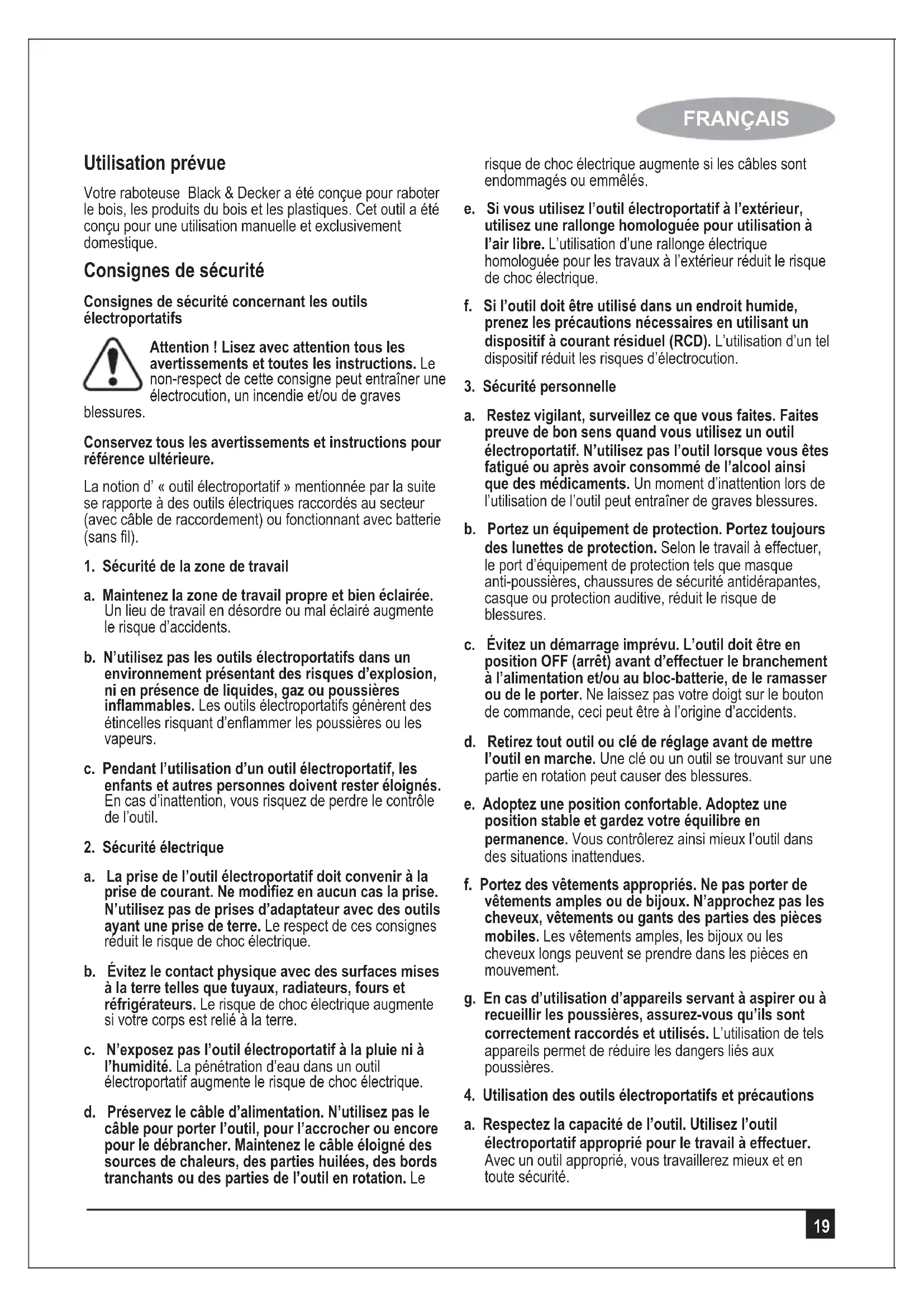 M18 FRANÇAIS O19 FRANÇAIS Utilisation prévue Votre raboteuse Black & Decker a été conçue pour raboter le bois, les produits du bois et les plastiques. Cet outil a été conçu pour une utilisation manuelle et exclusivement domestique. Consignes de sécurité Consignes de sécurité concernant les outils électroportatifs Attention ! Lisez avec attention tous les avertissements et toutes les instructions. Le non-respect de cette consigne peut entraîner une électrocution, un incendie et/ou de graves blessures. Conservez tous les avertissements et instructions pour référence ultérieure. La notion d’ « outil électroportatif » mentionnée par la suite se rapporte à des outils électriques raccordés au secteur (avec câble de raccordement) ou fonctionnant avec batterie (sans fil).