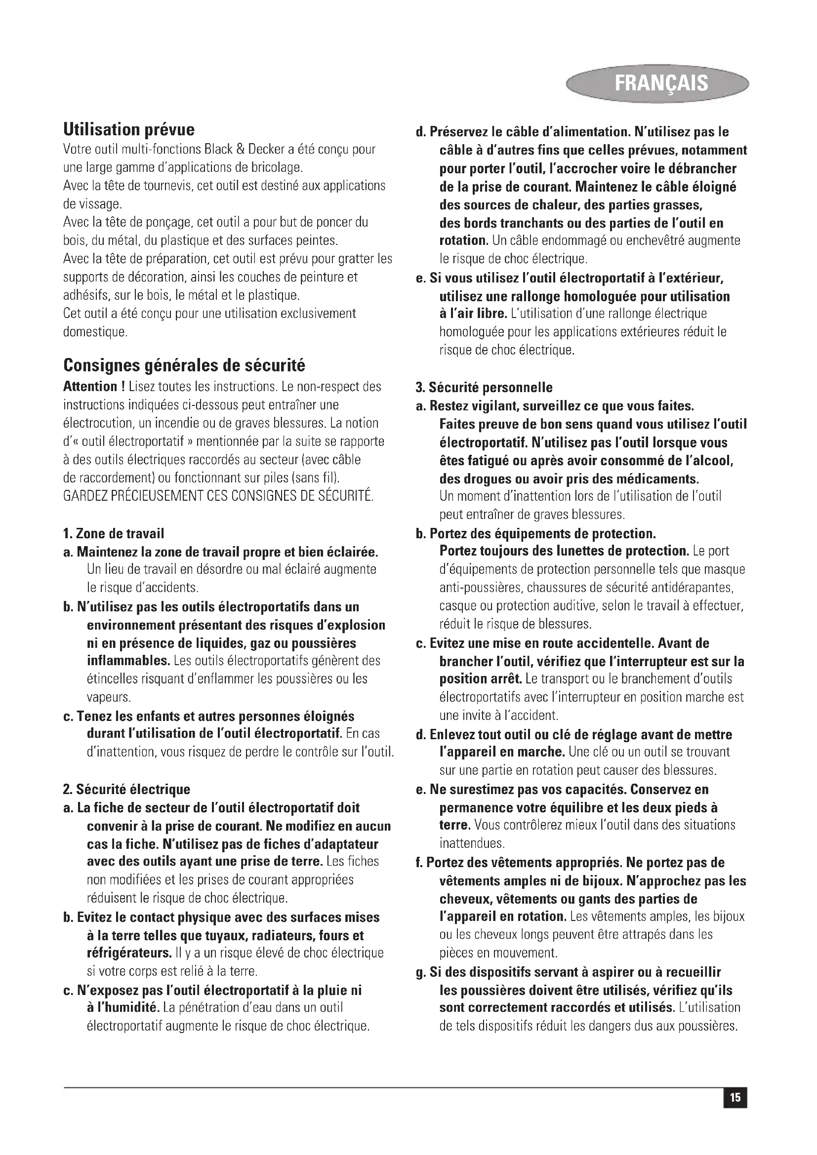(incertitude de la puissance acoustique) 3 dB(A) Kevin Hewitt Directeur Ingénierie Client Spennymoor, County Durham DL16 6JG, Royaume Uni 1-12-2004 Garantie Black & Decker est confiant dans la qualité de ses produits et vous offre une garantie très étendue. Ce certificat de garantie est un document supplémentaire et ne peut en aucun cas se substituer à vos droits légaux. La garantie est valable sur tout le territoire des Etats Membres de l’Union Européenne et de la Zone de Libre Echange Européenne. Si un produit Black & Decker s’avère défectueux en raison de matériaux en mauvaises conditions, d’une erreur humaine, ou d’un manque de conformité dans les 24 mois suivant la date d’achat, Black & Decker garantit le remplacement des pièces défectueuses, la réparation des produits usés ou cassés ou remplace ces produits à la convenance du client, sauf dans les circonstances suivantes : ◆ Le produit a été utilisé dans un but commercial, professionnel, ou a été loué. ◆ Le produit a été mal utilisé ou avec négligence. ◆ Le produit a subi des dommages à cause d’objets étrangers, de substances ou à cause d’accidents. ◆ Des réparations ont été tentées par des techniciens ne faisant pas partie du service technique de Black & Decker. Pour avoir recours à la garantie, il est nécessaire de fournir une preuve d’achat au vendeur ou à un réparateur agréé. Pour connaître l’adresse du réparateur agréé le plus proche de chez vous, contactez le bureau Black & Decker à l’adresse indiquée dans ce manuel. Vous pourrez aussi trouver une liste des réparateurs agréés de Black & Decker et de plus amples détails sur notre service après-vente sur le site Internet à l’adresse suivante : www.2helpU.com Visitez notre site Web www.blackanddecker.fr pour enregistrer votre nouveau produit Black & Decker et être informé des nouveaux produits et des offres spéciales. Pour plus d’informations concernant la marque Black & Decker et notre gamme de produits, consultez notre site www.blackanddecker.fr20 ITALIANO Uso previsto Il vostro elettroutensile multifunzione Black & Decker è stato progettato per coprire una vasta gamma di applicazioni del fai da te. Inserendo la testa di avvitatura, questo elettroutensile può essere impiegato per avvitare e svitare. Inserendo la testa per levigare, questo elettroutensile può essere impiegato per levigare legno, metallo, plastica e superfici verniciate. Inserendo la testa di preparazione delle superfici, questo elettroutensile può essere impiegato per raschiare materiali decorativi come strati di vernice e adesivi da superfici in legno, metallo e plastica. L’utensile é stato progettato per un uso individuale. Norme generali di sicurezza Attenzione! Leggere tutte le istruzioni. La mancata osservanza delle presenti istruzioni potrebbe causare scosse elettriche, incendi e/o infortuni gravi. Il termine “elettroutensile” che ricorre in tutte le avvertenze seguenti si riferisce ad utensili elettrici con o senza filo.