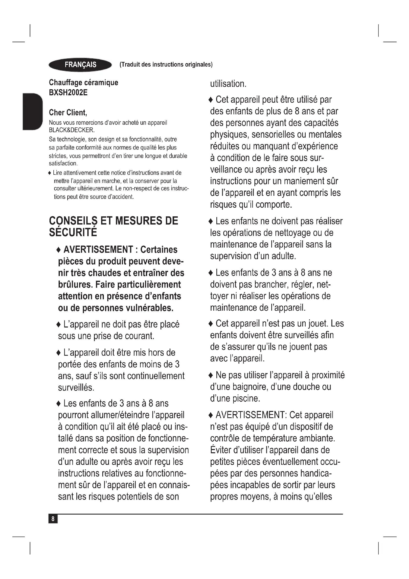 Chauffage céramique BXSH2002E Cher Client, Nous vous remercions d’avoir acheté un appareil BLACK&DECKER. Sa technologie, son design et sa fonctionnalité, outre sa parfaite conformité aux normes de qualité les plus strictes, vous permettront d’en tirer une longue et durable satisfaction. ♦ Lire attentivement cette notice d’instructions avant de mettre l’appareil en marche, et la conserver pour la consulter ultérieurement. Le non-respect de ces instruc- tions peut être source d’accident.