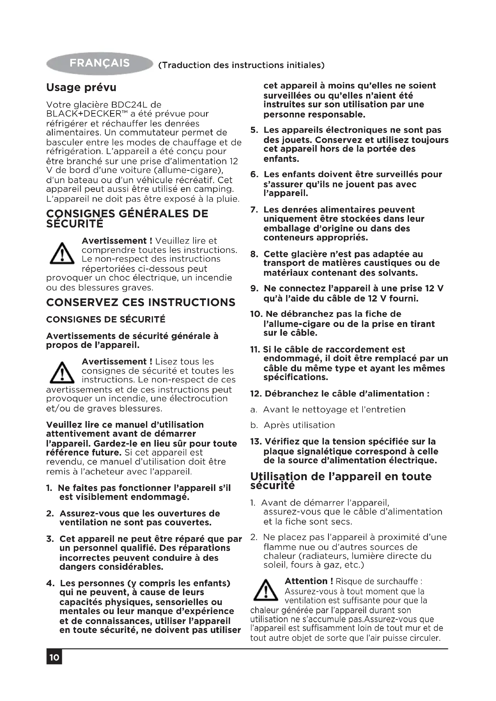 Plug firmly into unit socket and wall outlet. Loose contact between plug and unit socket. Unit is exposed to direct sunlight. Ventilator or propeller is blocked. The unit is too closed to the wall or an object. Place the unit in a shady, cool place with good airflow. Clean the ventilator and the propeller. Move the unit away from the wall or other objects. There is a burning smell or the case is deformed10 FRANÇAIS (Traduction des instructions initiales) Usage prévu Votre glacière BDC24L de BLACK+DECKER™ a été prévue pour réfrigérer et réchauer les denrées alimentaires. Un commutateur permet de basculer entre les modes de chauage et de réfrigération. L’appareil a été conçu pour être branché sur une prise d’alimentation 12 V de bord d’une voiture (allume-cigare), d’un bateau ou d’un véhicule récréatif. Cet appareil peut aussi être utilisé en camping. L’appareil ne doit pas être exposé à la pluie.