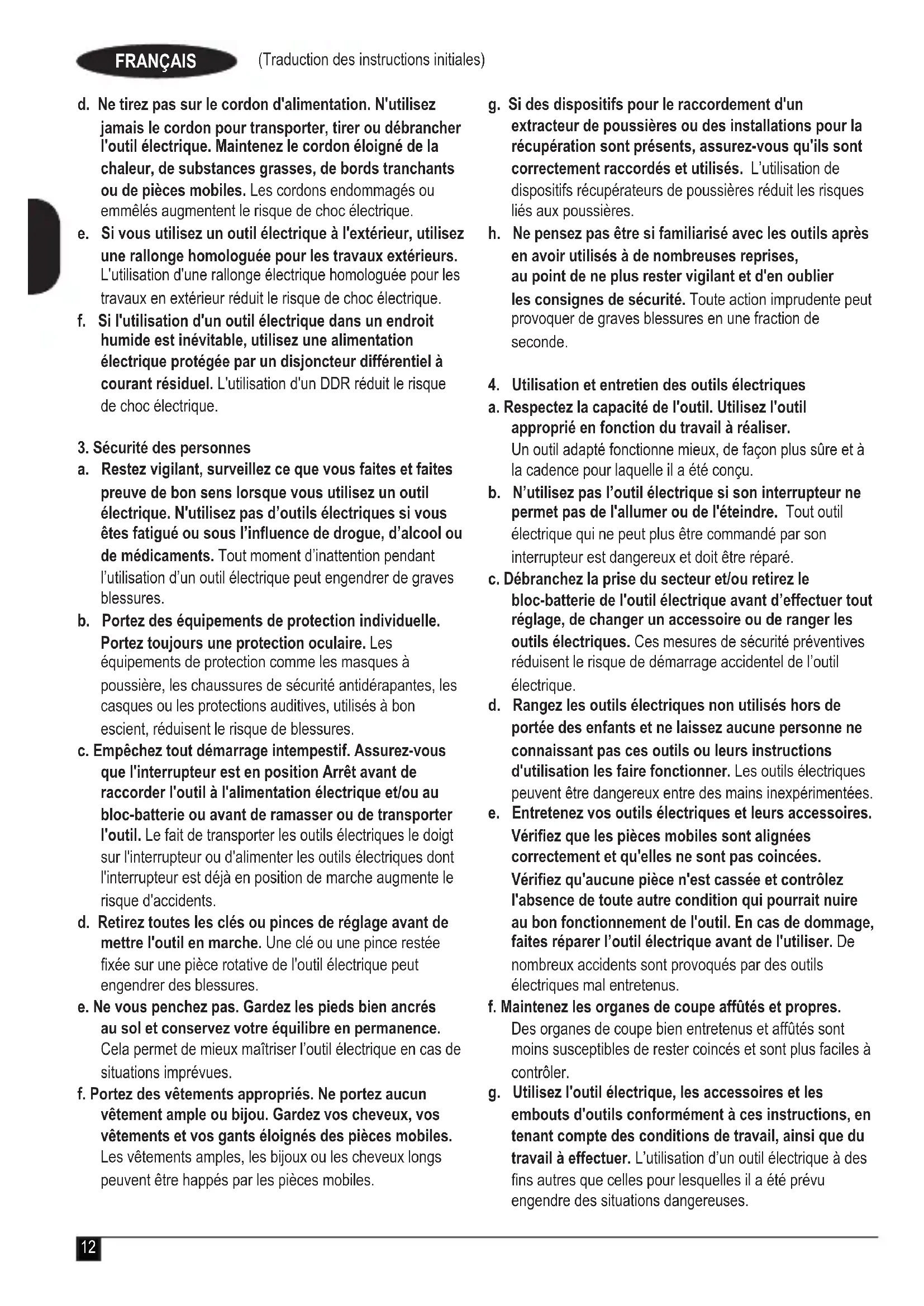 a. Lesprisesdesoutilsélectriquesdoivent correspondre à la prise de courant murale. Ne modiezjamaislaprised'aucunesorte.N'utilisez aucunadaptateuravecdesoutilsélectriquesreliésà la terre. L’utilisation de prises d’origine et de prises murales appropriées permet de réduire le risque de choc électrique. b. Éviteztoutcontactphysiqueavecdessurfacesreliées à la terre comme des tuyaux, des radiateurs, des fours et des réfrigérateurs par exemple. Il y a sinon un risque accru de choc électrique si votre corps est lui-même relié à la terre. c. N'exposezpaslesoutilsélectriquesàlapluie,nià l'humidité. Le risque de choc électrique augmente si de l'eau pénètre dans un outil électrique.12 (Traduction des instructions initiales) FRANÇAIS d. Ne tirez pas sur le cordon d'alimentation. N'utilisez jamais le cordon pour transporter, tirer ou débrancher l'outilélectrique.Maintenezlecordonéloignédela chaleur, de substances grasses, de bords tranchants oudepiècesmobiles. Les cordons endommagés ou emmêlés augmentent le risque de choc électrique. e. Sivousutilisezunoutilélectriqueàl'extérieur,utilisez une rallonge homologuée pour les travaux extérieurs. L'utilisation d'une rallonge électrique homologuée pour les travaux en extérieur réduit le risque de choc électrique. f. Sil'utilisationd'unoutilélectriquedansunendroit humide est inévitable, utilisez une alimentation électriqueprotégéeparundisjoncteurdifférentielà courant résiduel. L'utilisation d'un DDR réduit le risque de choc électrique.