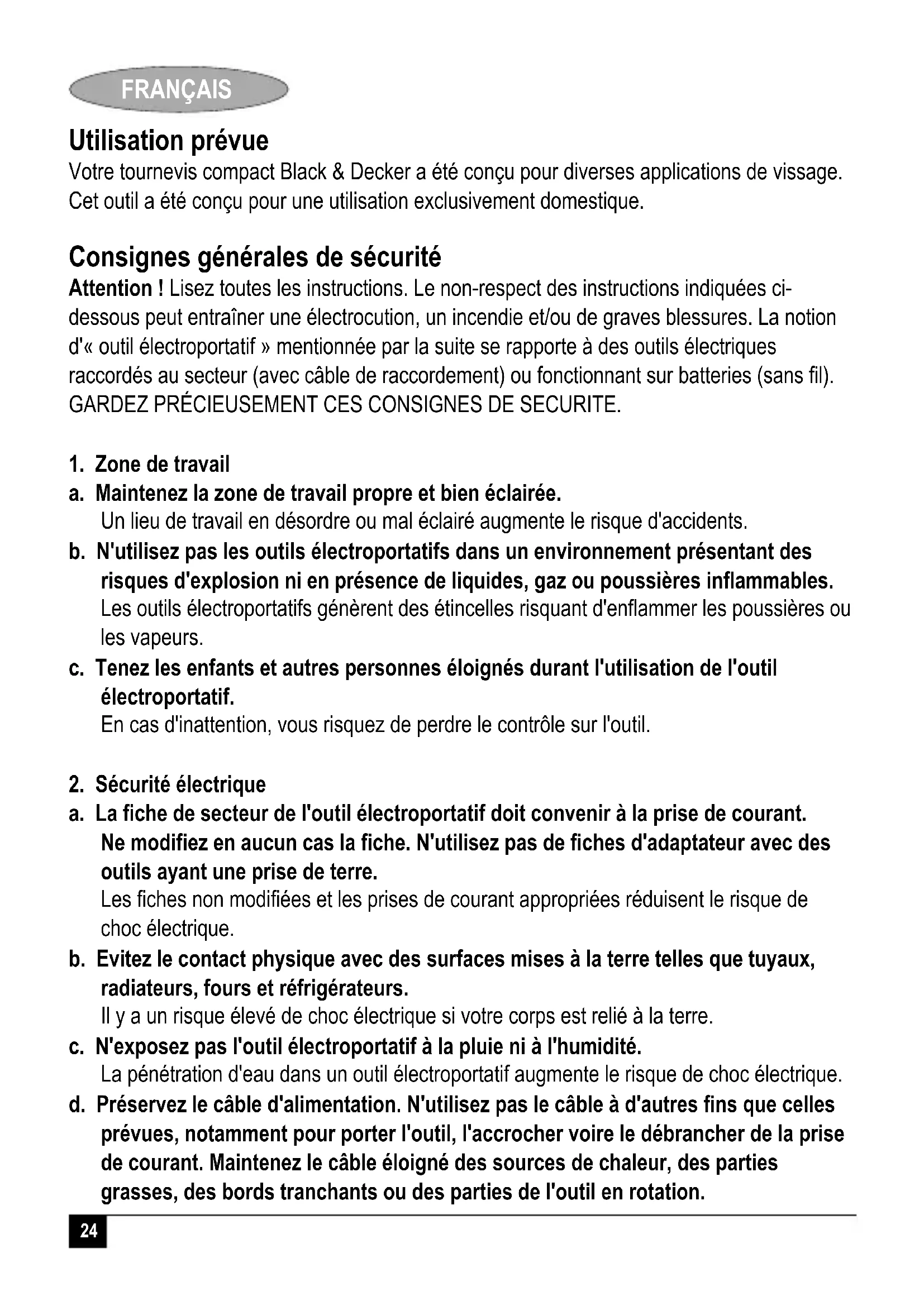 (incertitude de la pression acoustique) 3 dB(A) Kevin Hewitt Directeur Ingénierie Client Spennymoor, County Durham DL16 6JG, Royaume Uni 1-12-2006 Garantie Black & Decker est confiant dans la qualité de ses produits et vous offre une garantie très étendue. Ce certificat de garantie est un document supplémentaire et ne peut en aucun cas se substituer à vos droits légaux. La garantie est valable sur tout le territoire des Etats Membres de l'Union Européenne et de la Zone de Libre Echange Européenne. Si un produit Black & Decker s'avère défectueux en raison de matériaux en mauvaises conditions, d'une erreur humaine, ou d'un manque de conformité dans les 24 mois suivant la date d'achat, Black & Decker garantit le remplacement des pièces défectueuses, la réparation des produits usés ou cassés ou remplace ces produits à la convenance du client, sauf dans les circonstances suivantes : Le produit a été utilisé dans un but commercial, professionnel, ou a été loué. Le produit a été mal utilisé ou avec négligence. Le produit a subi des dommages à cause d'objets étrangers, de substances ou à cause d'accidents. Des réparations ont été tentées par des techniciens ne faisant pas partie du service technique de Black & Decker.34 FRANÇAIS Pour avoir recours à la garantie, il est nécessaire de fournir une preuve d'achat au vendeur ou à un réparateur agréé. Pour connaître l'adresse du réparateur agréé le plus proche de chez vous, contactez le bureau Black & Decker à l'adresse indiquée dans ce manuel. Vous pourrez aussi trouver une liste des réparateurs agréés de Black & Decker et de plus amples détails sur notre service après-vente sur le site Internet à l'adresse suivante : www.2helpU.com Visitez notre site Web www.blackanddecker.fr pour enregistrer votre nouveau produit Black & Decker et être informé des nouveaux produits et des offres spéciales. Pour plus d'informations concernant la marque Black & Decker et notre gamme de produits, consultez notre site www.blackanddecker.fr35 ITALIANO Uso previsto L'avvitatore compatto Black & Decker è stato progettato per avvitare/svitare. L'utensile é stato progettato per un uso individuale. Norme generiche di sicurezza Avvertenza: leggere tutte le istruzioni. La mancata osservazione delle presenti istruzioni potrebbe causare scosse elettriche, incendi e/o infortuni gravi. Il termine "elettroutensile" che ricorre in tutti le avvertenze seguenti si riferisce ad utensili elettrici con o senza filo. CONSERVARE QUESTE ISTRUZIONI.