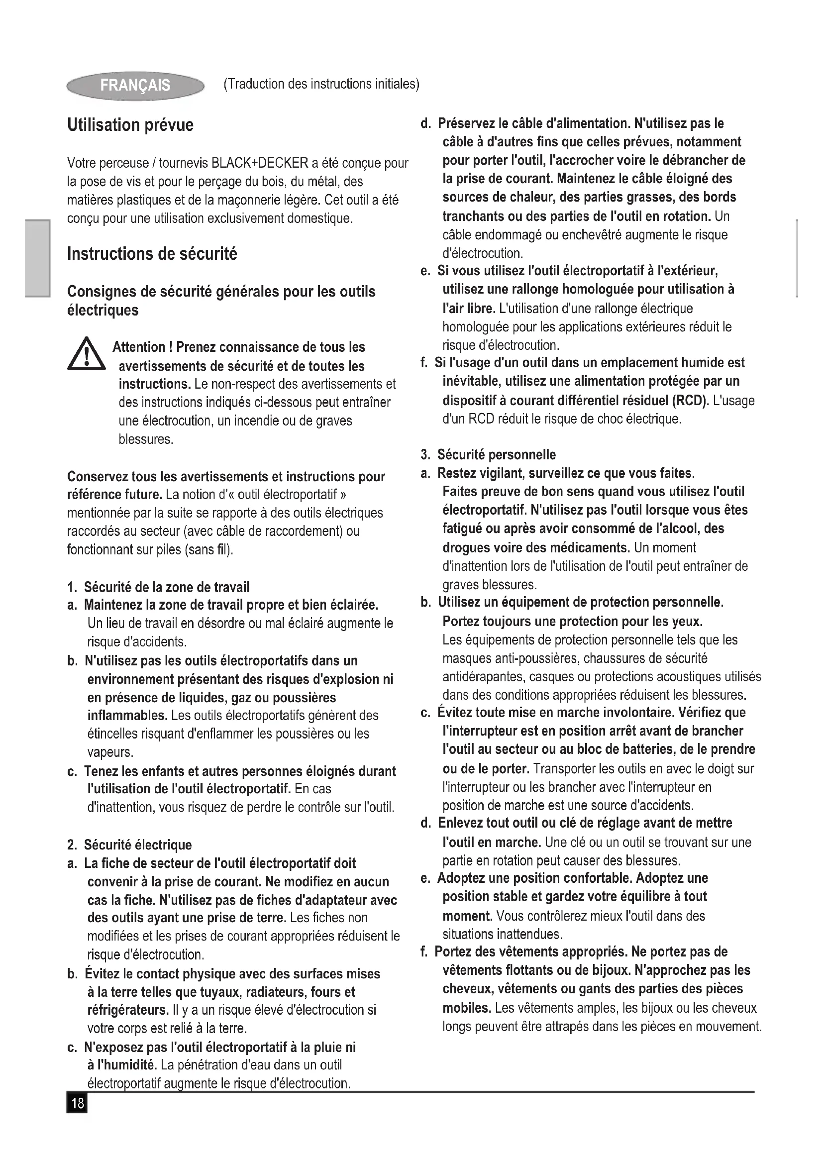 Votre perceuse / tournevis BLACK+DECKER a été conçue pour la pose de vis et pour le percage du bois, du métal, des matières plastiques et de la maçonnerie légère. Cet outil a été conçu pour une utilisation exclusivement domestique.