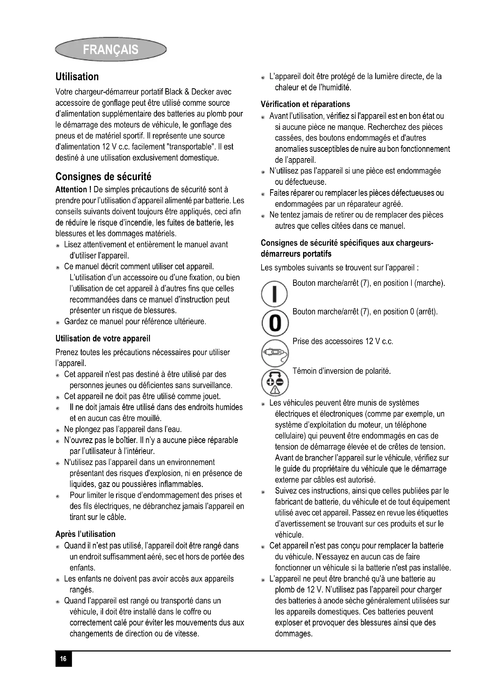 Garantie Black & Decker vertraut auf die Qualität der eigenen Geräte und bietet dem Käufer eine außergewöhnliche Garantie. Diese Garantiezusage versteht sich unbeschadet der gesetzlichen Gewährleistungsansprüche und schränkt diese keinesfalls ein. Sie gilt in sämtlichen Mitgliedsstaaten der Europäischen Union und der Europäischen Freihandelszone EFTA. Tritt innerhalb von 24 Monaten ab Kaufdatum an einem Gerät von Black & Decker ein auf Material- oder Verarbeitungsfehler zurückzuführender Mangel auf, garantiert Black & Decker den Austausch defekter Teile, die Reparatur von Geräten mit üblichem Verschleiß bzw. den Austausch eines mangelhaften Gerätes, ohne dass dem Kunden dabei mehr als unvermeidlich Unannehmlichkeiten entstehen, allerdings vorbehaltlich folgender Ausnahmen: X wenn das Gerät gewerblich, beruflich oder im Verleihgeschäft benutzt wurde; BDV012I Akku Typ 12 V, 17 Ah, Bleisäure, gekapselt Ausgang (Impulsbelastung) A 450 Ausgang (konstante Belastung für 5 Sekunden) A300 Kompressorleistung psi 120 Gewicht kg 7,9 Akkuladegerät Eingang VAC 230 Ungefähre Dauer des Ladevorgangs Std 48 Gewicht kg 0,215 DEUTSCH X wenn das Gerät missbräuchlich verwendet oder mit mangelnder Sorgfalt behandelt wurde; X wenn das Gerät durch irgendwelche Fremdeinwirkung beschädigt wurde; X wenn ein unbefugter Reparaturversuch durch anderes Personal als das einer Vertragswerkstatt oder des Black & Decker-Kundendienstes unternommen wurde. Zur Inanspruchnahme dieser Garantie ist dem Verkäufer bzw. der Vertragswerkstatt ein Kaufnachweis vorzulegen. Die Adresse der zuständigen Niederlassung von Black & Decker steht in dieser Anleitung. Diese teilt Ihnen gerne die nächstgelegene Vertragswerkstatt mit. Außerdem ist eine Liste der Vertragswerkstätten und aller Kundendienststellen von Black & Decker sowie der zuständigen Ansprechpartner im Internet zu finden unter: www.2helpU.com Bitte besuchen Sie unsere Webseite www.blackanddecker.de, um Ihr neues Black & Decker- Produkt zu registrieren. Dort erhalten Sie auch Informationen über neue Produkte und Sonderangebote. Weitere Informationen über die Marke Black & Decker und unsere Produkte finden Sie unter www.blackanddecker.de.16 FRANÇAIS Français Utilisation Votre chargeur-démarreur portatif Black & Decker avec accessoire de gonflage peut être utilisé comme source d’alimentation supplémentaire des batteries au plomb pour le démarrage des moteurs de véhicule, le gonflage des pneus et de matériel sportif. Il représente une source d'alimentation 12 V c.c. facilement "transportable". Il est destiné à une utilisation exclusivement domestique. Consignes de sécurité Attention ! De simples précautions de sécurité sont à prendre pour l’utilisation d’appareil alimenté par batterie. Les conseils suivants doivent toujours être appliqués, ceci afin de réduire le risque d’incendie, les fuites de batterie, les blessures et les dommages matériels. 8 Lisez attentivement et entièrement le manuel avant d’utiliser l’appareil. 8 Ce manuel décrit comment utiliser cet appareil. L’utilisation d’un accessoire ou d’une fixation, ou bien l’utilisation de cet appareil à d’autres fins que celles recommandées dans ce manuel d’instruction peut présenter un risque de blessures. 8 Gardez ce manuel pour référence ultérieure. Utilisation de votre appareil Prenez toutes les précautions nécessaires pour utiliser l’appareil. 8 Cet appareil n'est pas destiné à être utilisé par des personnes jeunes ou déficientes sans surveillance. 8 Cet appareil ne doit pas être utilisé comme jouet. 8 Il ne doit jamais être utilisé dans des endroits humides et en aucun cas être mouillé. 8 Ne plongez pas l’appareil dans l’eau. 8 N’ouvrez pas le boîtier. Il n’y a aucune pièce réparable par l’utilisateur à l’intérieur. 8 N'utilisez pas l’appareil dans un environnement présentant des risques d'explosion, ni en présence de liquides, gaz ou poussières inflammables. 8 Pour limiter le risque d’endommagement des prises et des fils électriques, ne débranchez jamais l’appareil en tirant sur le câble. Après l’utilisation 8 Quand il n’est pas utilisé, l’appareil doit être rangé dans un endroit suffisamment aéré, sec et hors de portée des enfants. 8 Les enfants ne doivent pas avoir accès aux appareils rangés. 8 Quand l’appareil est rangé ou transporté dans un véhicule, il doit être installé dans le coffre ou correctement calé pour éviter les mouvements dus aux changements de direction ou de vitesse. 8 L’appareil doit être protégé de la lumière directe, de la chaleur et de l’humidité. Vérification et réparations 8 Avant l’utilisation, vérifiez si l'appareil est en bon état ou si aucune pièce ne manque. Recherchez des pièces cassées, des boutons endommagés et d'autres anomalies susceptibles de nuire au bon fonctionnement de l’appareil. 8 N’utilisez pas l’appareil si une pièce est endommagée ou défectueuse. 8 Faites réparer ou remplacer les pièces défectueuses ou endommagées par un réparateur agréé. 8 Ne tentez jamais de retirer ou de remplacer des pièces autres que celles citées dans ce manuel. Consignes de sécurité spécifiques aux chargeurs- démarreurs portatifs Les symboles suivants se trouvent sur l’appareil : 8 Les véhicules peuvent être munis de systèmes électriques et électroniques (comme par exemple, un système d’exploitation du moteur, un téléphone cellulaire) qui peuvent être endommagés en cas de tension de démarrage élevée et de crêtes de tension. Avant de brancher l’appareil sur le véhicule, vérifiez sur le guide du propriétaire du véhicule que le démarrage externe par câbles est autorisé. 8 Suivez ces instructions, ainsi que celles publiées par le fabricant de batterie, du véhicule et de tout équipement utilisé avec cet appareil. Passez en revue les étiquettes d’avertissement se trouvant sur ces p