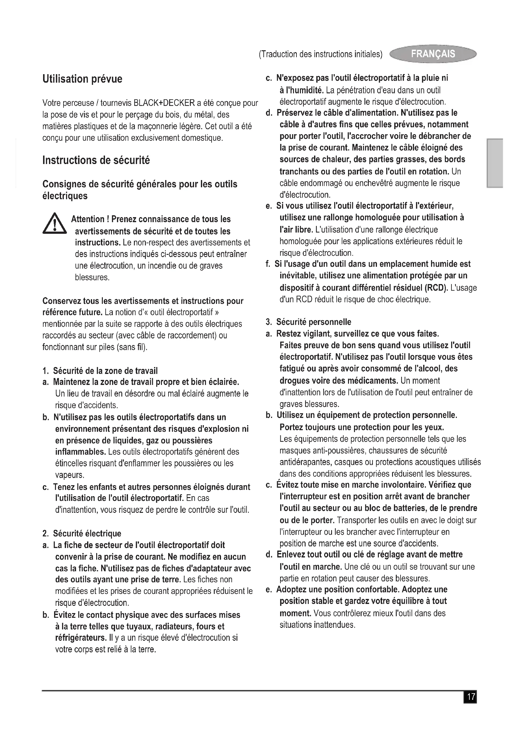 BDK48/BDK188 Black & Decker conrme que les produits décrits dans les "Données techniques" sont conformes aux normes : 2006/42/CE, EN 60745-1, EN 60745-2-1 Garantie Black & Decker est conant dans la qualité de ses produits et vous offre une garantie très étendue. Ce certicat de garantie est un document supplémentaire et ne peut en aucun cas se substituer à vos droits légaux. La garantie est valable sur tout le territoire des Etats Membres de l'Union Européenne et de la Zone de Libre Echange Européenne. Si un produit Black & Decker s'avère défectueux en raison de matériaux en mauvaises conditions, d'une erreur humaine, ou d'un manque de conformité dans les 24 mois suivant la date d'achat, Black & Decker garantit le remplacement des pièces défectueuses, la réparation des produits usés ou cassés ou remplace ces produits à la convenance du client, sauf dans les circonstances suivantes : u Le produit a été utilisé dans un but commercial, professionnel, ou a été loué. u Le produit a été mal utilisé ou avec négligence. u Le produit a subi des dommages à cause d'objets étrangers, de substances ou à cause d'accidents. u Des réparations ont été tentées par des techniciens ne faisant pas partie du service technique de Black & Decker. Pour avoir recours à la garantie, il est nécessaire de fournir une preuve d'achat au vendeur ou à un réparateur agréé. Pour connaître l'adresse du réparateur agréé le plus proche de chez vous, contactez le bureau Black & Decker à l'adresse indiquée dans ce manuel. Vous pourrez aussi trouver une liste des réparateurs agréés de Black & Decker et de plus amples détails sur notre service après-vente sur le site Internet à l'adresse suivante : www.2helpU.com Visitez notre site Web www.blackanddecker.fr pour enregistrer votre nouveau produit BLACK+DECKER et être informé des nouveaux produits et des offres spéciales. Pour plus d'informations concernant la marque BLACK+DECKER et notre gamme de produits, consultez notre site www.blackanddecker.fr Ces produits sont conformes aux Directives 2014/30/UE et 2011/65/UE. Pour plus de détails, veuillez contacter Black & Decker à l'adresse suivante ou reportez-vous au dos du manuel. Le soussigné est responsable des données de la che tech- nique et fait cette déclaration au nom de Black & Decker. R. Laverick Engineering Manager Black & Decker Europe, 210 Bath Road, Slough, Berkshire, SL1 3YD Royaume-Uni 05/09/201424 (Traduzione del testo originale) ITALIANO Uso previsto Il trapano / cacciavite BLACK+DECKER è stato progettato per inserire ed estrarre viti e trapanare legno, metalli, plastica e muratura. L'utensile é stato progettato per un uso individuale. Precauzioni di sicurezza Avvisi generali di sicurezza per l'elettroutensile