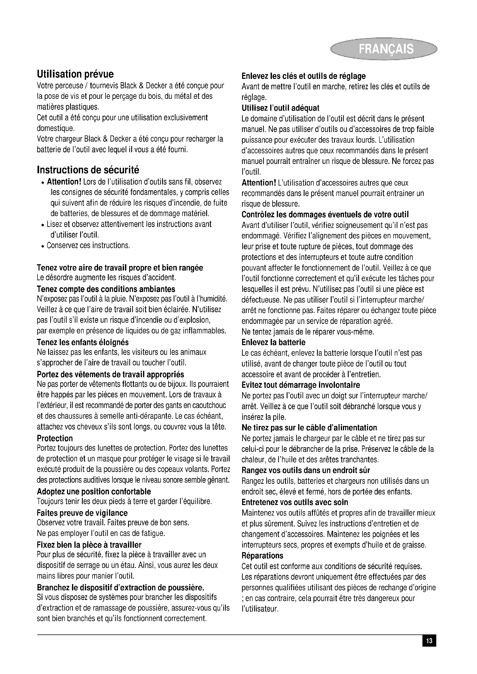 Colin Wills Director of Engineering BDCI, 4/F, 2 Dai Wang Street Tai Po Industrial Estate Tai Po NT, Hong Kong12 DEUTSCH Garantie Black & Decker vertraut auf die Qualität der eigenen Geräte und bietet dem Käufer eine außergewöhnliche Garantie. Diese Garantiezusage versteht sich unbeschadet der gesetzlichen Gewährleistungsansprüche und schränkt diese keinesfalls ein. Sie gilt in sämtlichen Mitgliedsstaaten der Europäischen Union und der Europäischen Freihandelszone EFTA. Tritt innerhalb von 24 Monaten ab Kaufdatum an einem Gerät von Black & Decker ein auf Material- oder Verarbeitungsfehler zurückzuführender Mangel auf, garantiert Black & Decker den Austausch defekter Teile, die Reparatur von Geräten mit üblichem Verschleiß bzw. den Austausch eines mangelhaften Geräts, ohne den Kunden dabei mehr als unbedingt nötig in Anspruch zu nehmen, allerdings vorbehaltlich folgender Ausnahmen: ◆ wenn das Gerät gewerblich, beruflich oder im Verleihgeschäft benutzt wurde; ◆ wenn das Gerät mißbräuchlich verwendet oder mit mangelnder Sorgfalt behandelt wurde; ◆ wenn das Gerät durch irgendwelche Fremdeinwirkung beschädigt wurde; ◆ wenn ein unbefugter Reparaturversuch durch anderes Personal als das einer Vertragswerkstatt oder des Black & Decker-Kundendienstes unternommen wurde. Zur Inanspruchnahme dieser Garantie ist dem Verkäufer bzw. der Vertragswerkstatt ein Kaufnachweis vorzulegen. Der Kaufnachweis muß Kaufdatum und Gerätetyp bescheinigen. Die Adresse des zuständigen Büros von Black & Decker steht in dieser Anleitung, darüber läßt sich die nächstgelegene Vertragswerkstatt ermitteln. Außerdem ist eine Liste der Vertragswerkstätten und aller Kundendienststellen von Black & Decker sowie der zuständigen Ansprechpartner im Internet zu finden unter: www.2helpU.com.13 FRANÇAIS Utilisation prévue Votre perceuse / tournevis Black & Decker a été conçue pour la pose de vis et pour le perçage du bois, du métal et des matières plastiques. Cet outil a été conçu pour une utilisation exclusivement domestique. Votre chargeur Black & Decker a été conçu pour recharger la batterie de l’outil avec lequel il vous a été fourni. Instructions de sécurité ◆ Attention! Lors de l’utilisation d’outils sans fil, observez les consignes de sécurité fondamentales, y compris celles qui suivent afin de réduire les risques d’incendie, de fuite de batteries, de blessures et de dommage matériel. ◆ Lisez et observez attentivement les instructions avant d’utiliser l’outil. ◆ Conservez ces instructions. Tenez votre aire de travail propre et bien rangée Le désordre augmente les risques d’accident. Tenez compte des conditions ambiantes N’exposez pas l’outil à la pluie. N’exposez pas l’outil à l’humidité. Veillez à ce que l’aire de travail soit bien éclairée. N’utilisez pas l’outil s’il existe un risque d’incendie ou d’explosion, par exemple en présence de liquides ou de gaz inflammables. Tenez les enfants éloignés Ne laissez pas les enfants, les visiteurs ou les animaux s’approcher de l’aire de travail ou toucher l’outil. Portez des vêtements de travail appropriés Ne pas porter de vêtements flottants ou de bijoux. Ils pourraient être happés par les pièces en mouvement. Lors de travaux à l’extérieur, il est recommandé de porter des gants en caoutchouc et des chaussures à semelle anti-dérapante. Le cas échéant, attachez vos cheveux s’ils sont longs, ou couvrez vous la tête. Protection Portez toujours des lunettes de protection. Portez des lunettes de protection et un masque pour protéger le visage si le travail exécuté produit de la poussière ou des copeaux volants. Portez des protections auditives lorsque le niveau sonore semble gênant. Adoptez une position confortable Toujours tenir les deux pieds à terre et garder l’équilibre. Faites preuve de vigilance Observez votre travail. Faites preuve de bon sens. Ne pas employer l’outil en cas de fatigue. Fixez bien la pièce à travailler Pour plus de sécurité, fixez la pièce à travailler avec un dispositif de serrage ou un étau. Ainsi, vous aurez les deux mains libres pour manier l’outil. Branchez le dispositif d’extraction de poussière. Si vous disposez de systèmes pour brancher les dispositifs d’extraction et de ramassage de poussière, assurez-vous qu’ils sont bien branchés et qu’ils fonctionnent correctement. Enlevez les clés et outils de réglage Avant de mettre l’outil en marche, retirez les clés et outils de réglage. Utilisez l’outil adéquat Le domaine d’utilisation de l’outil est décrit dans le présent manuel. Ne pas utiliser d’outils ou d’accessoires de trop faible puissance pour exécuter des travaux lourds. L’utilisation d’accessoires autres que ceux recommandés dans le présent manuel pourrait entraîner un risque de blessure. Ne forcez pas l’outil. Attention! L’utilisation d’accessoires autres que ceux recommandés dans le présent manuel pourrait entrainer un risque de blessure. Contrôlez les dommages éventuels de votre outil Avant d’utiliser l’outil, vérifiez soigneusement qu’il n’est pas endommagé. Vérifiez l’alignement des pièces en mouvement, leur prise et toute rupture de pièces, tout dommage des protections et des interrupteurs et toute autre condition pouvant affecter le fonctionnement de l’outil. Veillez à ce que l’outil fonctionne correctement et qu’il exécute les tâches pour lesquelles il est prévu. N’utilisez pas l’outil si une pièce est défectueuse. Ne pas utiliser l’outil si l’interrupteur marche/ arrêt ne fonctionne pas. Faites réparer ou échangez toute pièce endommagée par un service de réparation agréé. Ne tentez jamais de le réparer vous-même. Enlevez la batterie Le cas échéant, enlevez la batterie lorsque l’outil n’est pas utilisé, avant de changer toute pièce de l’outil ou tout accessoire et avant de procéder à