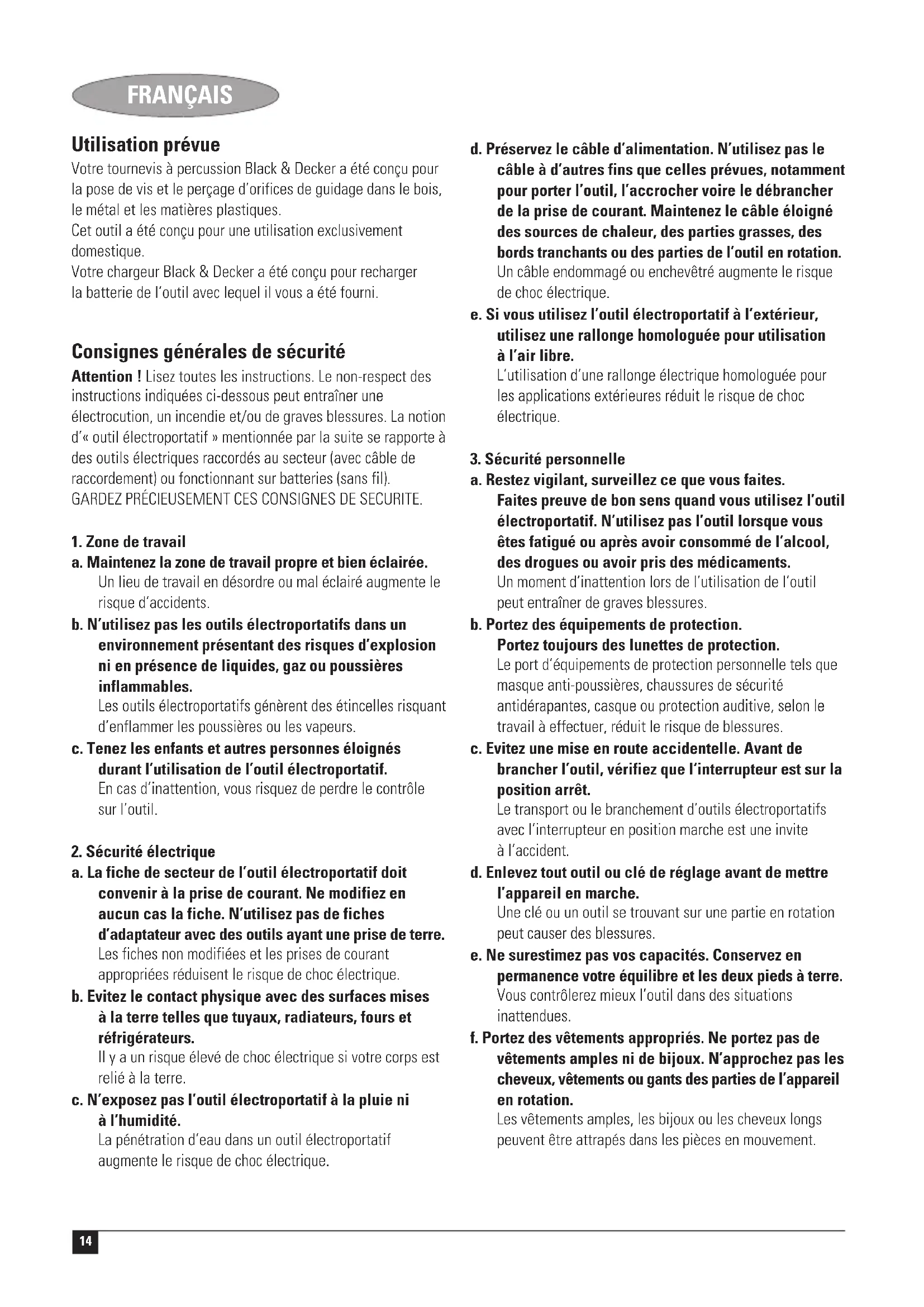 a. Faites réparer votre outil électroportatif uniquement par du personnel qualifié et seulement avec des pièces de rechange d’origine. Cela garantira le maintien de la sécurité de votre outil. Instructions de sécurité supplémentaires pour les perceuses à percussion ◆ Portez une protection auditive avec les perceuses à percussion. L’exposition au bruit peut causer des pertes de l’audtion. ◆ Utilisez les poignées additionnelles fournies avec l’outil. Une perte de contrôle peut provoquer des blessures. Instructions de sécurité supplémentaires pour perceuses / visseuses ◆ Tenez l’outil uniquement par les surfaces isolées des poignées si l’opération effectuée peut mettre la lame en contact avec des câbles électriques cachés ou son propre cordon électrique. Le contact avec un câble sous tension met les parties métalliques de l’outil sous tension et peut provoquer une électrocution de l’utilisateur.16 FRANÇAIS ◆ Utilisez des fixations ou tout autre moyen pratique pour fixer et soutenir la pièce à ouvrer sur une plate-forme stable. Si vous tenez la pièce à la main ou contre votre corps, elle est instable et vous pouvez en perdre le contrôle. ◆ Avant de percer les murs, les planchers ou les plafonds, vérifiez l’emplacement des fils électriques et des tuyaux. ◆ Evitez de toucher l’extrémité d’un foret juste après avoir percé car il peut être chaud. Instructions de sécurité supplémentaires pour les batteries et chargeurs Batteries ◆ Ne tentez jamais d’ouvrir pour quelque raison que ce soit. ◆ N’exposez pas la batterie à l’humidité. ◆ Ne stockez pas dans des endroits où la température peut dépasser 40 °C. ◆ Chargez uniquement à température ambiante, entre 10 °C et 40 °C. ◆ Chargez uniquement en utilisant le chargeur fourni avec l’outil. ◆ Lorsque vous jetez des batteries, suivez les instructions données à la section « Protection de l’environnement ». Chargeurs ◆ Utilisez uniquement votre chargeur Black & Decker pour charger les batteries fournies avec votre outil ou de même type et modèle. D’autres batteries pourraient exploser et causer des dommages ou blessures. ◆ Ne tentez jamais de charger des batteries non-rechargeables. ◆ Remplacez immédiatement les fils électriques défectueux. ◆ Ne mettez pas le chargeur en contact avec de l’eau. ◆ N’ouvrez pas le chargeur. ◆ Ne testez pas le chargeur. Le chargeur a été conçu pour être utilisé uniquement à l’intérieur. Lisez le manuel d’instruction avant utilisation. Transformateur à sécurité intrinsèque. L’alimentation secteur est électriquement séparée de la sortie du transformateur. Le chargeur s’arrête automatiquement si la température ambiante est trop élevée. Par conséquent, le chargeur devient inutilisable. L’unité doit être débranchée du secteur puis apportée à un centre d’entretien agréé pour réparation. Sécurité électrique Ce chargeur a une double isolation; un branchement à la terre n’est donc pas nécessaire. Vérifiez si la tension du chargeur correspond à la tension secteur. Ne tentez jamais de remplacer le chargeur par une prise au secteur normale. ◆ Cet appareil n’est pas destiné à être utilisé par des jeunes ou des personnes infirmes sans supervision. Les enfants ne doivent pas jouer avec l’appareil. ◆ Si le câble d’alimentation est endommagé, il doit être remplacé par le fabricant ou par un centre de réparation agréé Black & Decker afin d’éviter tout accident. Généralités