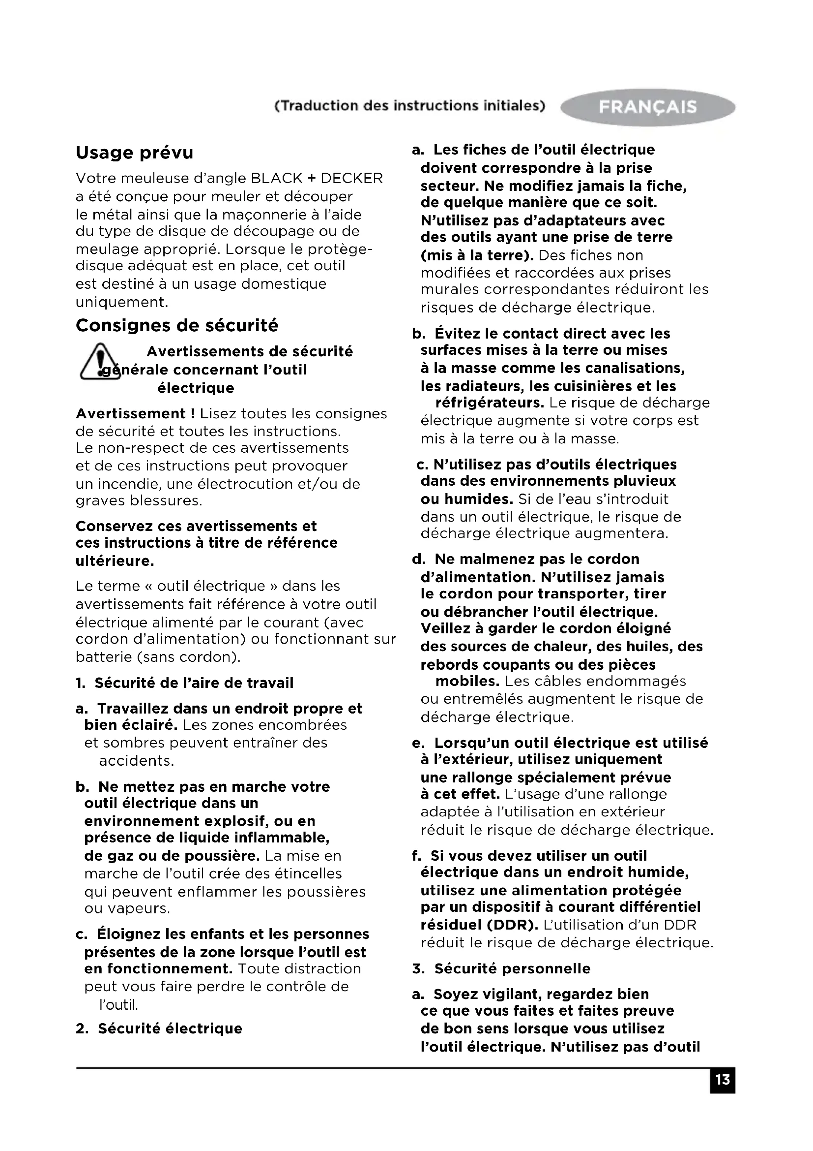 36ENGLISH Usage prévu Votre meuleuse d’angle BLACK + DECKER a été conçue pour meuler et découper le métal ainsi que la maçonnerie à l’aide du type de disque de découpage ou de meulage approprié. Lorsque le protège- disque adéquat est en place, cet outil est destiné à un usage domestique uniquement. Consignes de sécurité Avertissements de sécurité générale concernant l’outil électrique Avertissement ! Lisez toutes les consignes de sécurité et toutes les instructions. Le non-respect de ces avertissements et de ces instructions peut provoquer un incendie, une électrocution et/ou de graves blessures. Conservez ces avertissements et ces instructions à titre de référence ultérieure. Le terme « outil électrique » dans les avertissements fait référence à votre outil électrique alimenté par le courant (avec cordon d’alimentation) ou fonctionnant sur batterie (sans cordon).