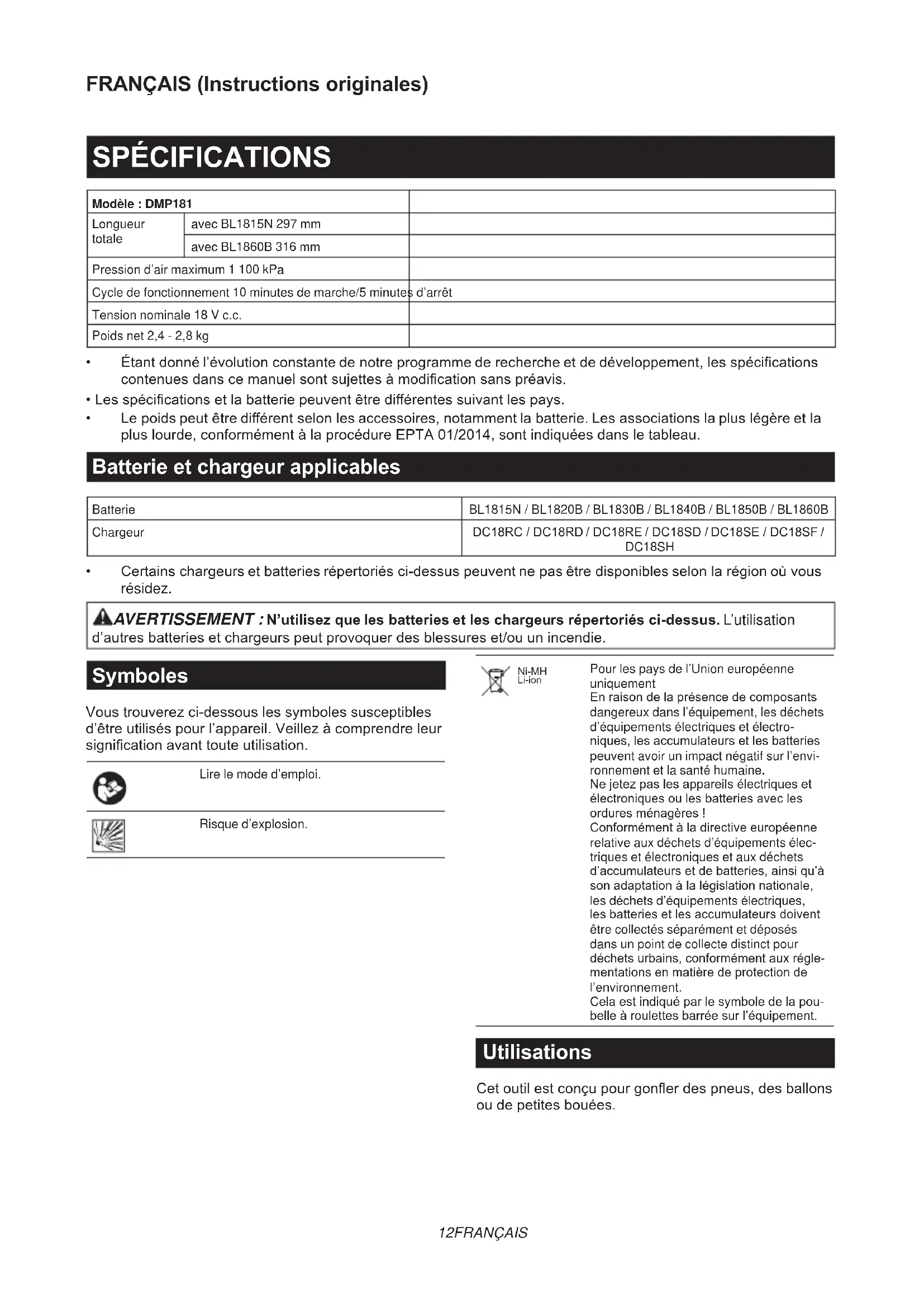 d’autres batteries et chargeurs peut provoquer des blessures et/ou un incendie. Symboles Vous trouverez ci-dessous les symboles susceptibles d’être utilisés pour l’appareil. Veillez à comprendre leur signication avant toute utilisation. Lire le mode d’emploi. Risque d’explosion. Ni-MH Li-ion Pour les pays de l’Union européenne uniquement En raison de la présence de composants dangereux dans l’équipement, les déchets d’équipements électriques et électro- niques, les accumulateurs et les batteries peuvent avoir un impact négatif sur l’envi- ronnement et la santé humaine. Ne jetez pas les appareils électriques et électroniques ou les batteries avec les ordures ménagères ! Conformément à la directive européenne relative aux déchets d’équipements élec- triques et électroniques et aux déchets d’accumulateurs et de batteries, ainsi qu’à son adaptation à la législation nationale, les déchets d’équipements électriques, les batteries et les accumulateurs doivent être collectés séparément et déposés dans un point de collecte distinct pour déchets urbains, conformément aux régle- mentations en matière de protection de l’environnement. Cela est indiqué par le symbole de la pou- belle à roulettes barrée sur l’équipement. Utilisations Cet outil est conçu pour goner des pneus, des ballons ou de petites bouées.13 FRANÇAIS Bruit Niveau de bruit pondéré A typique, déterminé selon EN62841-1 : Niveau de pression sonore (L