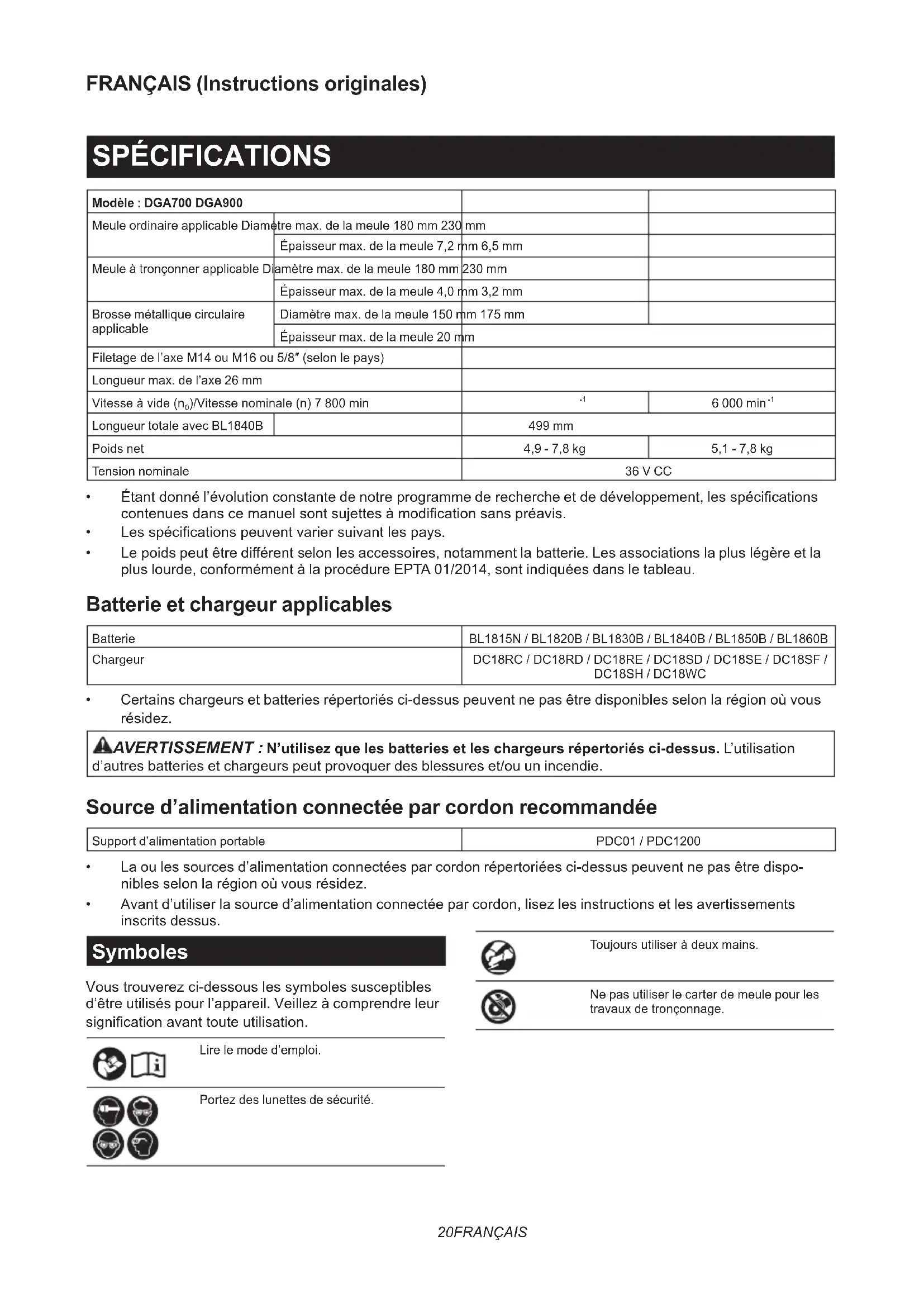 NOTE: Some items in the list may be included in the tool package as standard accessories. They may dier from country to country.20 FRANÇAIS FRANÇAIS (Instructions originales) SPÉCIFICATIONS Modèle : DGA700 DGA900 Meule ordinaire applicable Diamètre max. de la meule 180 mm 230 mm Épaisseur max. de la meule 7,2 mm 6,5 mm Meule à tronçonner applicable Diamètre max. de la meule 180 mm 230 mm Épaisseur max. de la meule 4,0 mm 3,2 mm Brosse métallique circulaire applicable Diamètre max. de la meule 150 mm 175 mm Épaisseur max. de la meule 20 mm Filetage de l’axe M14 ou M16 ou 5/8″ (selon le pays) Longueur max. de l’axe 26 mm Vitesse à vide (n