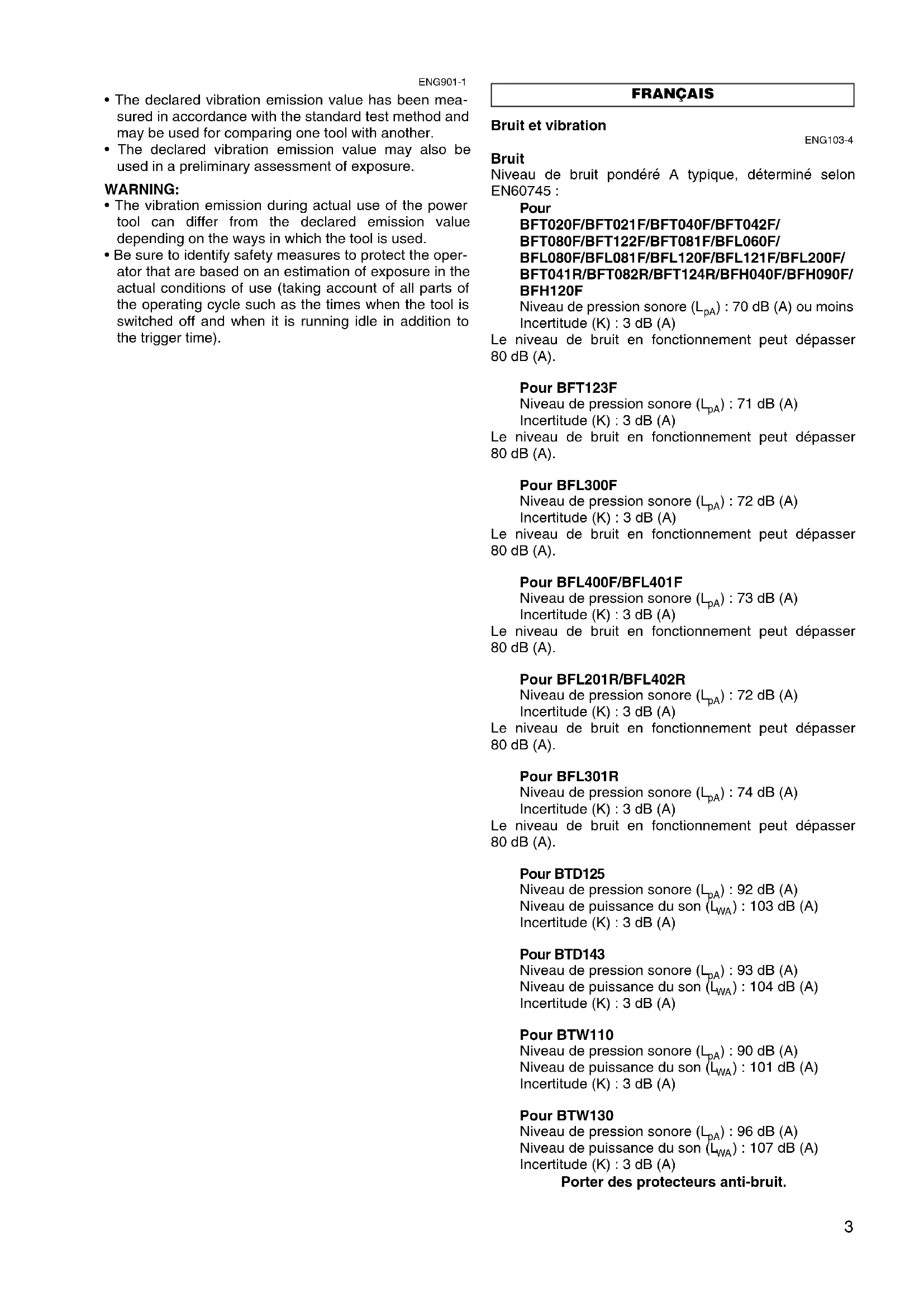 - Les mesures de sécurité à prendre pour protéger l’utili- sateur doivent être basées sur une estimation de l’exposition dans des conditions réelles d’utilisation (en tenant compte de toutes les composantes du cycle d’utilisation, comme par exemple le moment de sa mise hors tension, lorsqu’il tourne à vide et le moment de son déclenchement).5 Geräusch- und Vibrationsentwicklung ENG103-4 Geräusch Typischer A-bewerteter Geräuschpegel ermittelt gemäß EN60745: Für BFT020F/BFT021F/BFT040F/BFT042F/ BFT080F/BFT122F/BFT081F/BFL060F/ BFL080F/BFL081F/BFL120F/BFL121F/BFL200F/ BFT041R/BFT082R/BFT124R/BFH040F/BFH090F/ BFH120F Schalldruckpegel (L