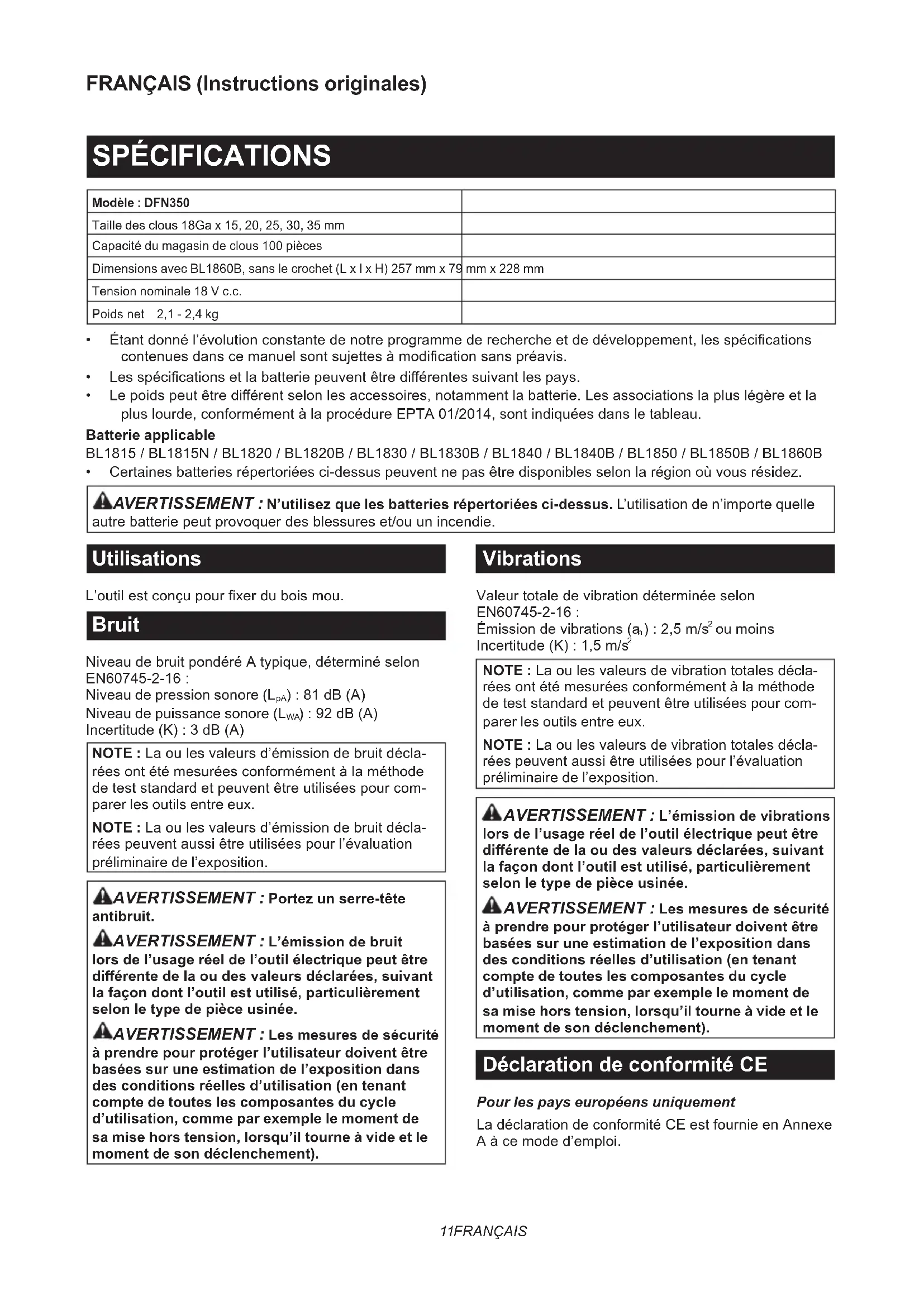 - Lepoidspeutêtrediérentselonlesaccessoires,notammentlabatterie.Lesassociationslapluslégèreetla pluslourde,conformémentàlaprocédureEPTA01/2014,sontindiquéesdansletableau. Batterie applicable BL1815/BL1815N/BL1820/BL1820B/BL1830/BL1830B/BL1840/BL1840B/BL1850/BL1850B/BL1860B
