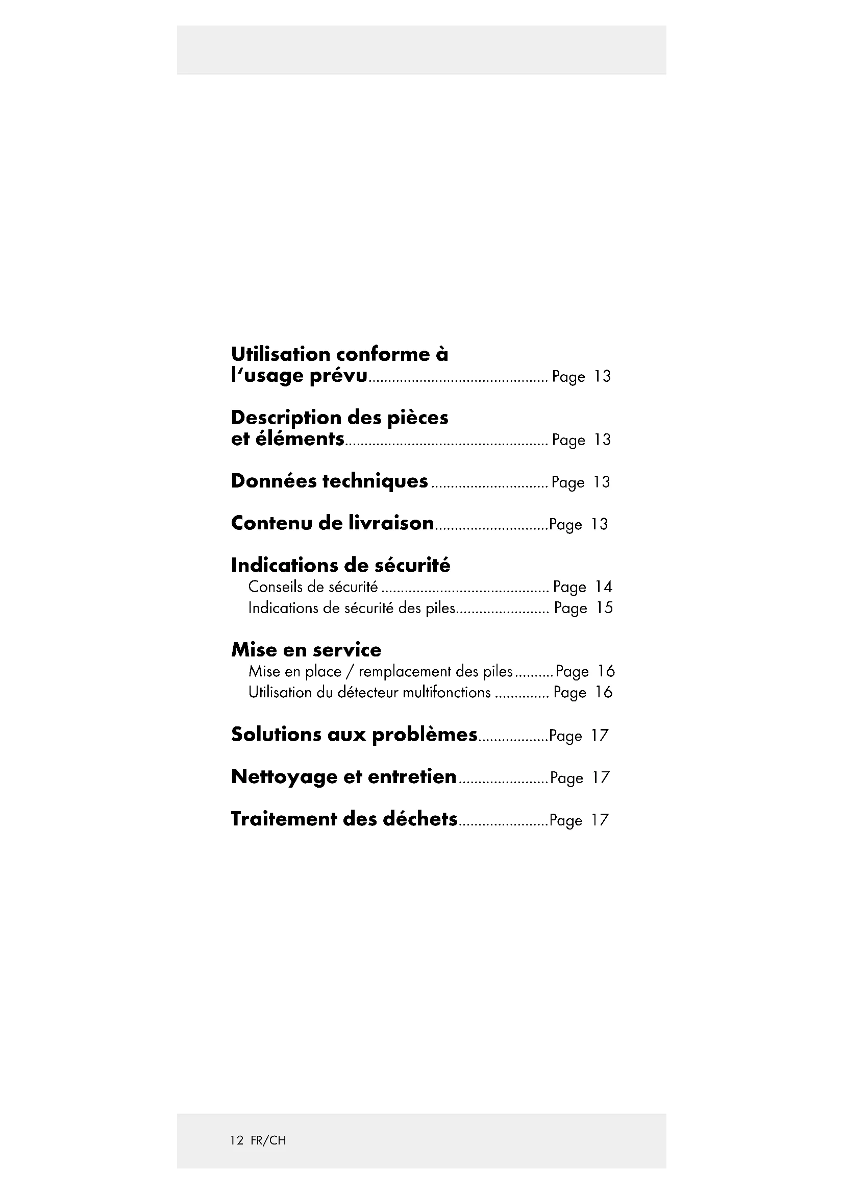 Utilisation conforme à l‘usage prévu .............................................. Page 13 Description des pièces et éléments .................................................... Page 13 Données techniques .............................. Page 13 Contenu de livraison ............................. Page 13 Indications de sécurité Conseils de sécurité ........................................... Page 14 Indications de sécurité des piles........................ Page 15 Mise en service Mise en place / remplacement des piles .......... Page 16 Utilisation du détecteur multifonctions .............. Page 16 Solutions aux problèmes .................. Page 17 Nettoyage et entretien ....................... Page 17 Traitement des déchets ....................... Page 1713 FR/CH Détecteur multifonctions