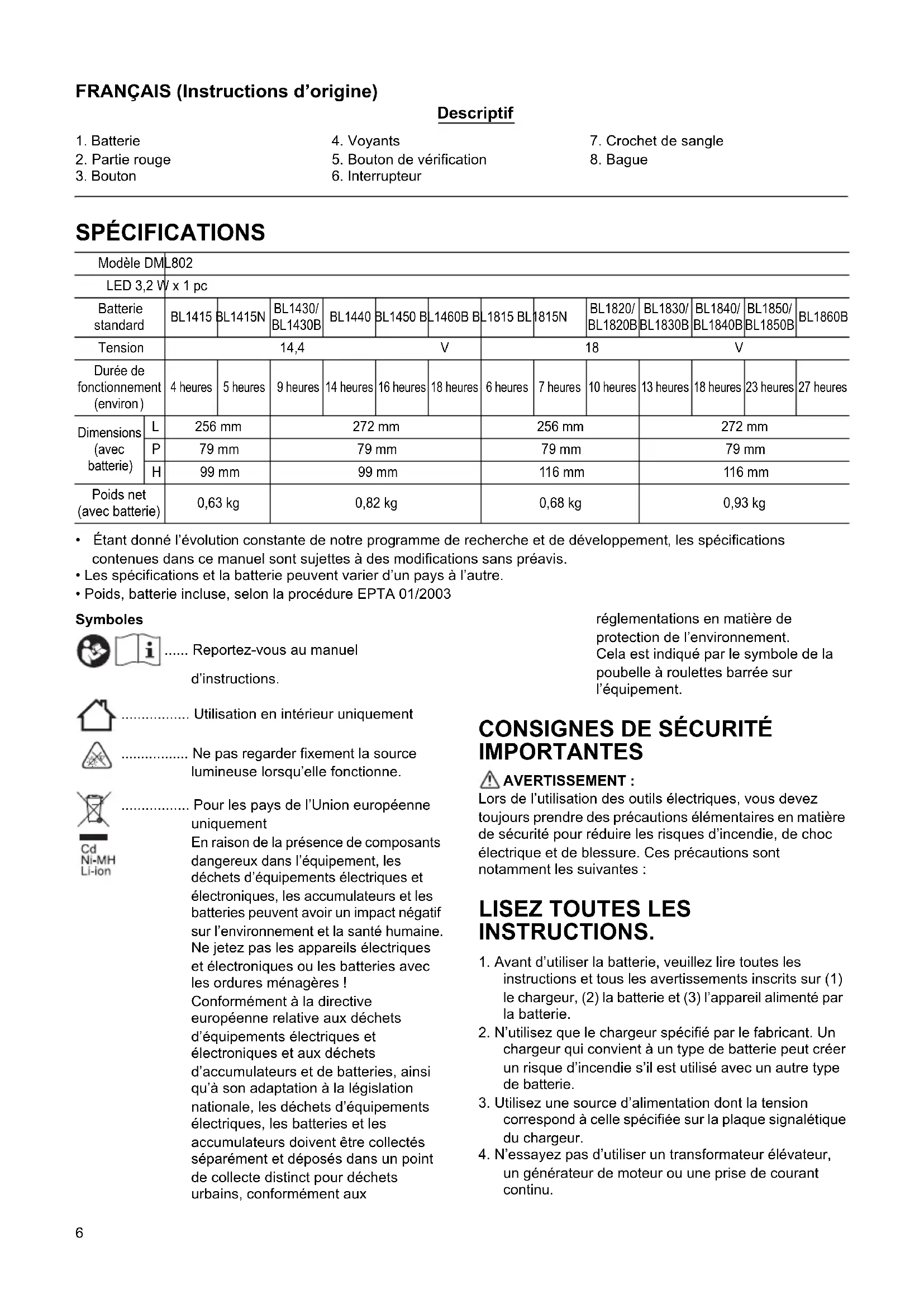 - Batterie et chargeur Makita authentiques REMARQUE : Certains éléments de la liste peuvent être inclus en tant qu’accessoires standard dans le coffret de l’outil envoyé. Ils peuvent varier suivant les pays. Voyants Autonomie restante Allumé Éteint Clignotant 75 % à 100 % 50 % à 75 % 25 % à 50 % 0% à 25% Recharger la batterie. Il est possible que la batterie ait mal fonctionné. Groupe de risque 2 ATTENTION! Le rayonnement optique émis par ce produit est potentiellement dangereux. La lampe d’opération ne doit pas être observée. Ce produit est potentiellement nocif pour les yeux. Produit testé contre le EN 624719 DEUTSCH (Originalanweisungen) Erklärung der Gesamtdarstellung SPEZIFIKATIONEN