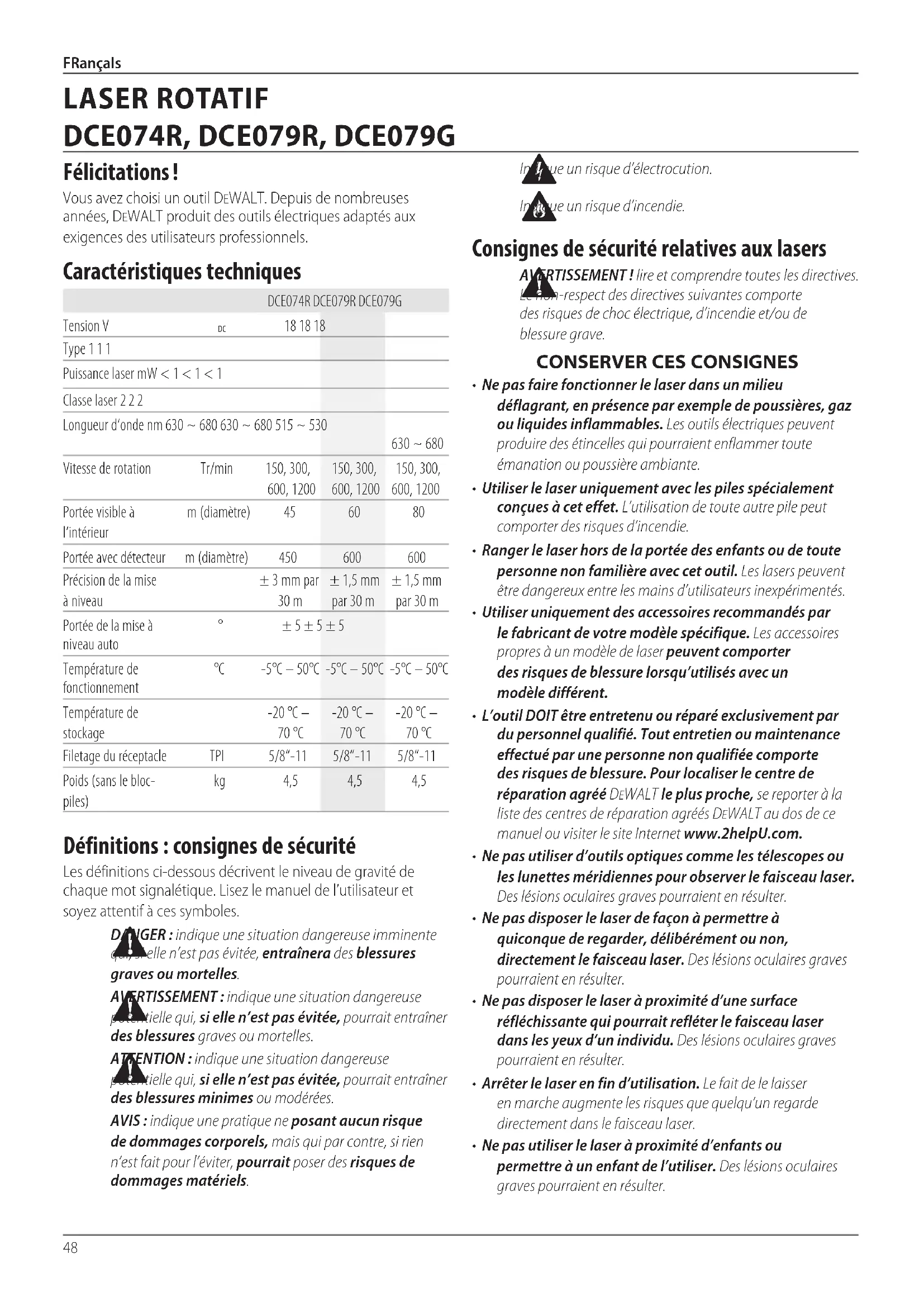 Type 1 1 1 Puissance laser mW < 1 < 1 < 1 Classe laser 2 2 2 Longueur d‘onde nm 630 ~ 680 630 ~ 680 515 ~ 530 630 ~ 680 Vitesse de rotation Tr/min 150, 300, 600, 1200 150, 300, 600, 1200 150, 300, 600, 1200 Portée visible à l‘intérieur m (diamètre) 45 60 80 Portée avec détecteur m (diamètre) 450 600 600 Précision de la mise à niveau ± 3 mm par 30 m ± 1,5 mm par 30 m ± 1,5 mm par 30 m Portée de la mise à niveau auto ° ± 5 ± 5 ± 5 Température de fonctionnement °C -5°C – 50°C -5°C – 50°C -5°C – 50°C Température de stockage -20 °C – 70 °C -20 °C – 70 °C -20 °C – 70 °C Filetage du réceptacle TPI 5/8“-11 5/8“-11 5/8“-11 Poids (sans le bloc- piles) kg 4,5 4,5 4,5 Définitions : consignes de sécurité Les définitions ci-dessous décrivent le niveau de gravité de chaque mot signalétique. Lisez le manuel de l’utilisateur et soyez attentif à cessymboles.