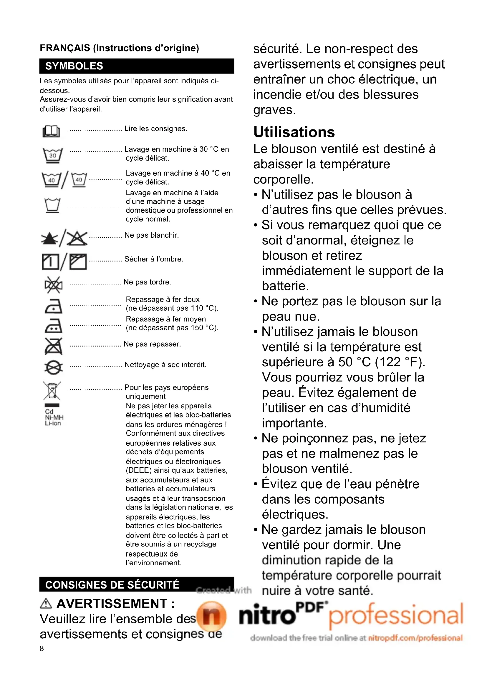 - Ne gardez jamais le blouson ventilé pour dormir. Une diminution rapide de la température corporelle pourrait nuire à votre santé. SYMBOLES .......................... Lire les consignes. .......................... Lavage en machine à 30 °C en cycle délicat.
