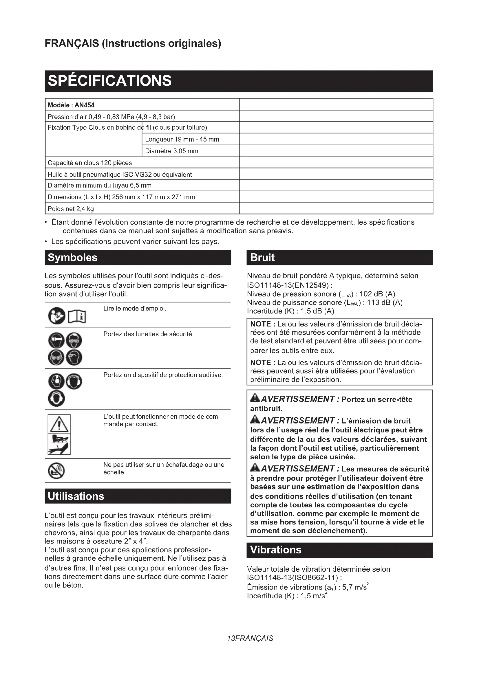 - Safety goggles NOTE: Some items in the list may be included in the tool package as standard accessories. They may dier from country to country.13 FRANÇAIS FRANÇAIS (Instructions originales) SPÉCIFICATIONS Modèle : AN454 Pression d’air 0,49 - 0,83 MPa (4,9 - 8,3 bar) Fixation Type Clous en bobine de l (clous pour toiture) Longueur 19 mm - 45 mm Diamètre 3,05 mm Capacité en clous 120 pièces Huile à outil pneumatique ISO VG32 ou équivalent Diamètre minimum du tuyau 6,5 mm Dimensions (L x l x H) 256 mm x 117 mm x 271 mm Poids net 2,4 kg