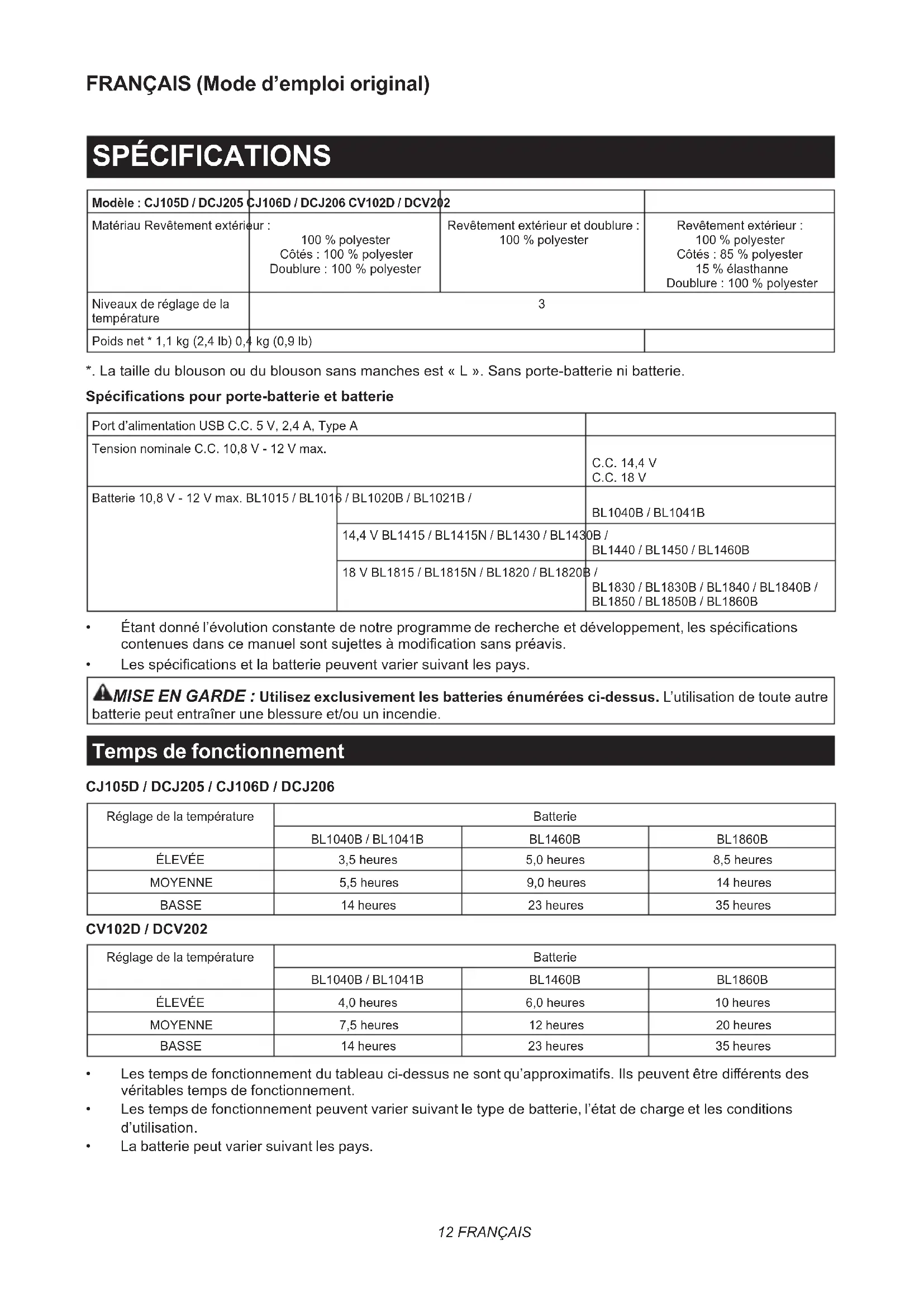 - Les spécications et la batterie peuvent varier suivant les pays. MISE EN GARDE : Utilisez exclusivement les batteries énumérées ci-dessus. L’utilisation de toute autre batterie peut entraîner une blessure et/ou un incendie. Temps de fonctionnement