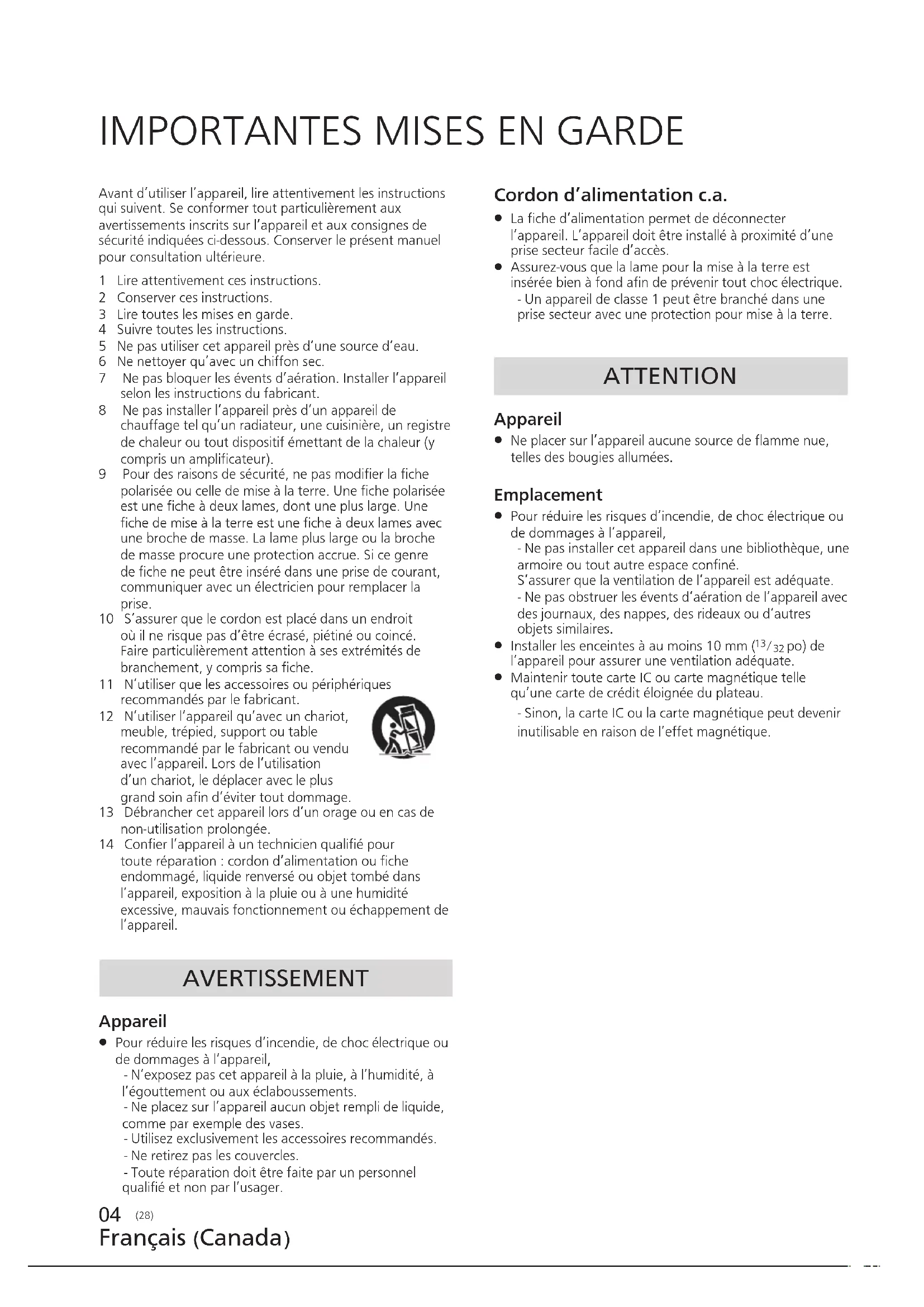 Pour réduire les risques d’incendie, de choc électrique ou de dommages à l’appareil, - N’exposez pas cet appareil à la pluie, à l’humidité, à l’égouttement ou aux éclaboussements. - Ne placez sur l’appareil aucun objet rempli de liquide, comme par exemple des vases. - Utilisez exclusivement les accessoires recommandés. - Ne retirez pas les couvercles. - Toute réparation doit être faite par un personnel qualifié et non par l’usager.Avant d’utiliser l’appareil, lire attentivement les instructions qui suivent. Se conformer tout particulièrement aux avertissements inscrits sur l’appareil et aux consignes de sécurité indiquées ci-dessous. Conserver le présent manuel pour consultation ultérieure.1 Lire attentivement ces instructions.2 Conserver ces instructions.3 Lire toutes les mises en garde.4 Suivre toutes les instructions.5 Ne pas utiliser cet appareil près d’une source d’eau.6 Ne nettoyer qu’avec un chiffon sec.7 Ne pas bloquer les évents d’aération. Installer l’appareil selon les instructions du fabricant.8 Ne pas installer l’appareil près d’un appareil de chauffage tel qu’un radiateur, une cuisinière, un registre de chaleur ou tout dispositif émettant de la chaleur (y compris un amplificateur).9 Pour des raisons de sécurité, ne pas modifier la fiche polarisée ou celle de mise à la terre. Une fiche polarisée est une fiche à deux lames, dont une plus large. Une fiche de mise à la terre est une fiche à deux lames avec une broche de masse. La lame plus large ou la broche de masse procure une protection accrue. Si ce genre de fiche ne peut être inséré dans une prise de courant, communiquer avec un électricien pour remplacer la prise.10 S’assurer que le cordon est placé dans un endroit où il ne risque pas d’être écrasé, piétiné ou coincé. Faire particulièrement attention à ses extrémités de branchement, y compris sa fiche.11 N’utiliser que les accessoires ou périphériques recommandés par le fabricant.12 N’utiliser l’appareil qu’avec un chariot, meuble, trépied, support ou table recommandé par le fabricant ou vendu avec l’appareil. Lors de l’utilisation d’un chariot, le déplacer avec le plus grand soin afin d’éviter tout dommage.13 Débrancher cet appareil lors d’un orage ou en cas de non-utilisation prolongée.14 Confier l’appareil à un technicien qualifié pour toute réparation : cordon d’alimentation ou fiche endommagé, liquide renversé ou objet tombé dans l’appareil, exposition à la pluie ou à une humidité excessive, mauvais fonctionnement ou échappement de l’appareil. Appareil