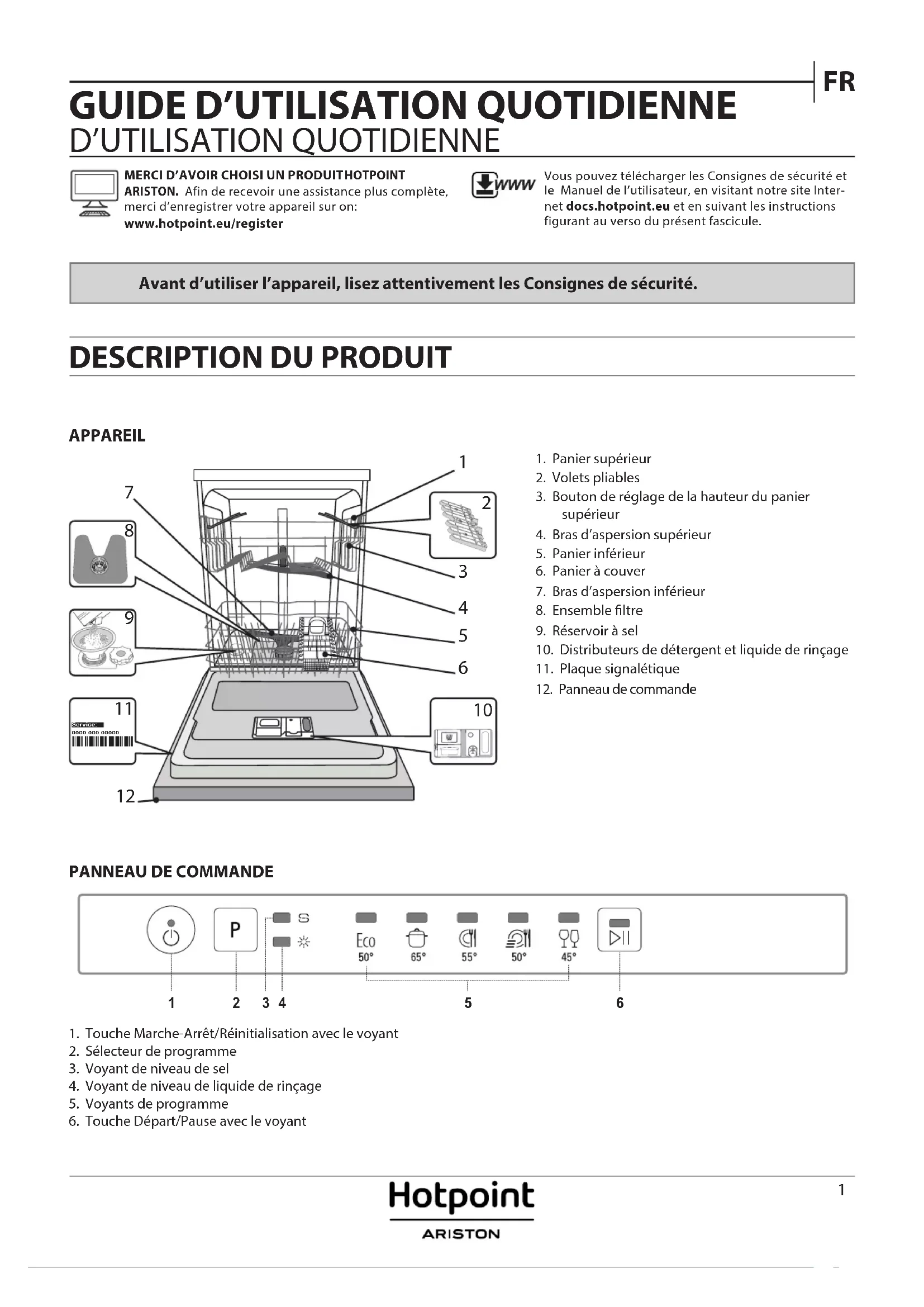 APPAREILPANNEAU DE COMMANDEMERCI D’AVOIR CHOISI UN PRODUIT HOTPOINT ARISTON. Afin de recevoir une assistance plus complète, merci d’enregistrer votre appareil sur on: www.hotpoint.eu/register Vous pouvez télécharger les Consignes de sécurité et le Manuel de l’utilisateur, en visitant notre site Inter-net docs.hotpoint.eu et en suivant les instructions figurant au verso du présent fascicule.1. Panier supérieur2. Volets pliables3. Bouton de réglage de la hauteur du panier supérieur4. Bras d’aspersion supérieur5. Panier inférieur6. Panier à couver7. Bras d’aspersion inférieur8. Ensemble ltre9. Réservoir à sel10. Distributeurs de détergent et liquide de rinçage11. Plaque signalétique12. Panneau de commande1. Touche Marche-Arrêt/Réinitialisation avec le voyant2. Sélecteur de programme3. Voyant de niveau de sel4. Voyant de niveau de liquide de rinçage5. Voyants de programme6. Touche Départ/Pause avec le voyant0000 000 00000 Service: