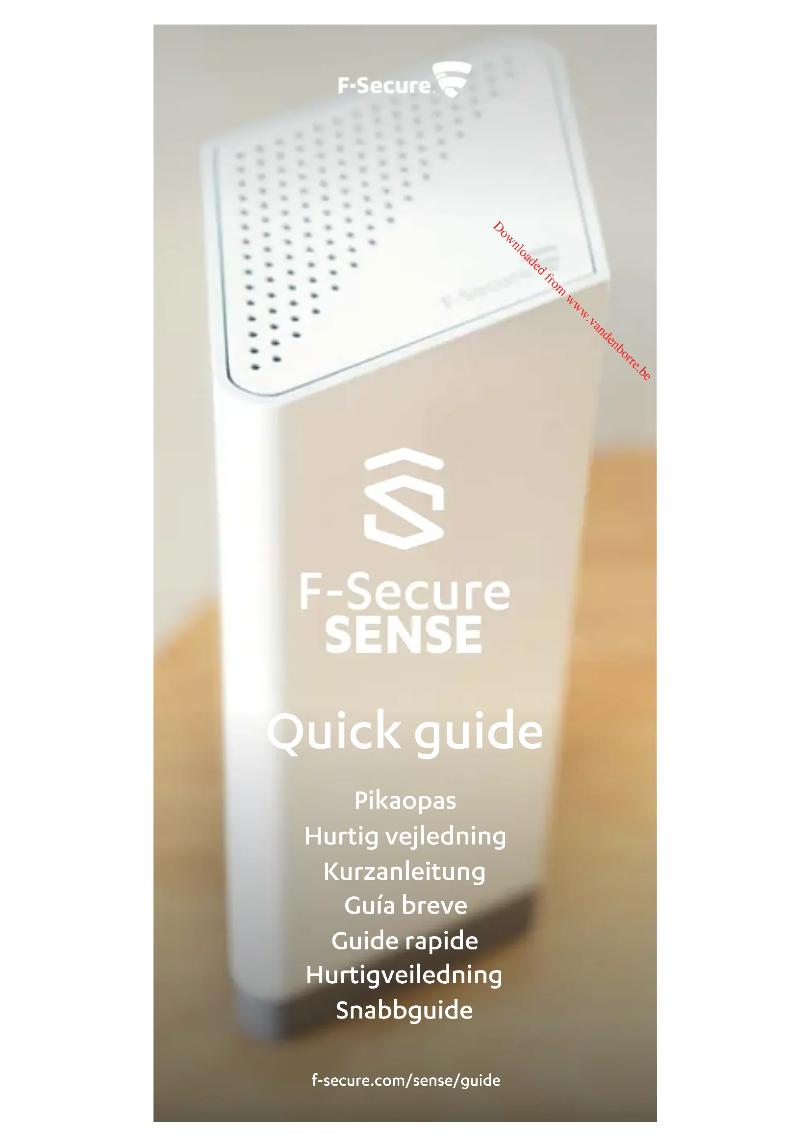 déplacement, téléchargez l’application F-Secure SENSE – disponible sur les plateformes iOS, Android et Windows (PC). Pour configurer votre réseau SENSE intelligent et sécurisé, téléchargez l’application F-Secure SENSE sur Google Play ou sur l’App Store d’Apple. Suivez ensuite les instructions dans l’application. Downloaded from www.vandenborre.be24 25Français • Guide rapide Français • Guide rapide Affichage Signification Que faire Aucun éclairage SENSE n’est pas alimenté. Vérifiez que le routeur SENSE est bien branché. La luminosité de l’affichage est trop faible. Modifiez la luminosité dans les paramètres de l’application. Affichage allumé SENSE démarre. Patientez pendant quelques minutes. Si rien ne se passe, débranchez le routeur SENSE, puis rebranchez- le. Si le problème persiste, une réinitialisation aux paramètres d’usine est nécessaire. Carrés statiques Carrés clignotants SENSE est prêt à procéder au couplage. Appuyez sur le bouton bleu situé à l’arrière du routeur SENSE. Quatre (4) chiffres Code de couplage. Ce dernier apparaît lorsque vous appuyez sur le bouton bleu de couplage. Suivez les instructions dans l’application SENSE. Carrés pivotants SENSE se connecte ou vérifie une action réalisée dans l’application. Cette opération peut prendre du temps. Suivez les instructions dans l’application. Signe plus (+) L’action est terminée. Aucune action n’est requise. Préparez-vous à la prochaine étape. Point d’exclamation SENSE a rencontré un problème. Vérifiez l’application SENSE. Mise à jour SENSE met à jour son logiciel et redémarrera automatiquement. Laissez le routeur SENSE branché et suivez les instructions dans l’application. Réinitialisation Le routeur SENSE a été réinitialisé. Attendez que le routeur SENSE redémarre, puis configurez-le. Réinitialisation aux paramètres d’usine Le routeur SENSE a été réinitialisé aux paramètres d’usine. Heure Vous êtes connecté et protégé. Profitez-en ! Connectez vos autres appareils au réseau SENSE par WiFi ou via un câble Ethernet.