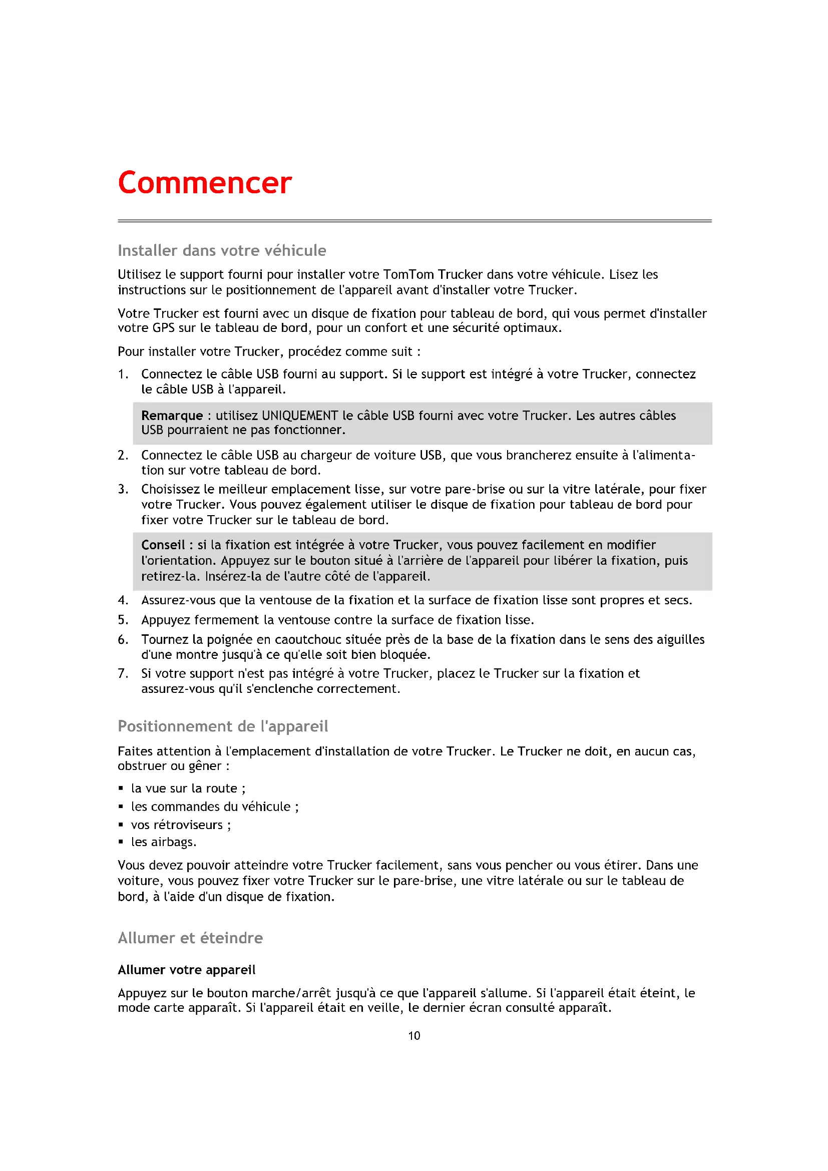 Important : avis de sécurité et avertissements GPS (Global Positioning System) et GLONASS (Global Navigation Satellite System) Les systèmes GPS (Global Positioning System) et GLONASS (Global Navigation Satellite System) sont des systèmes qui s'appuient sur les satellites pour fournir des informations d'emplacement et de temps partout dans le monde. Le système GPS est utilisé et contrôlé par le Gouvernement des États-Unis d'Amérique, à qui incombe la disponibilité et la précision du système. Le système GLONASS est utilisé et contrôlé par le Gouvernement de Russie, à qui incombe la disponibilité et la précision du système. Tout changement dans la disponibilité et la précision des systèmes GPS et GLONASS ou dans les conditions de l'environnement risque d'affecter le fonctionnement de cet appareil. TomTom décline toute responsabilité quant à la disponibilité et la précision des systèmes GPS et GLONASS. Messages de sécurité Utiliser avec précaution L'utilisation de produits TomTom lors de vos déplacements ne dispense en aucun cas de l'observation des règles de sécurité routière en vigueur. Votre appareil est conçu pour être une aide à la conduite et non un substitut, et ne vous dispense pas de faire preuve de prudence et de vigilance au volant. Respectez toujours les panneaux de signalisation et les lois en vigueur. Être distrait au volant peut être extrêmement dangereux. Veuillez ne pas utiliser cet appareil d'une façon susceptible de détourner dangereusement l'attention du conducteur de la route. TomTom vous recommande d'utiliser les systèmes mains-libres lorsqu'ils sont disponibles et d'arrêter complètement votre véhicule dans un endroit sécurisé pour manipuler l'appareil. Note pour les véhicules commerciaux et hors gabarit Si aucune carte pour poids lourd n'est installée sur ce produit, il est uniquement destiné à être utilisé dans les voitures et dans les véhicules commerciaux légers sans remorque : en effet, il ne proposera pas de parcours appropriés aux véhicules commerciaux, aux bus, aux camping-cars ou aux véhicules de loisirs. Si vous conduisez un véhicule de ce type, rendez-vous sur tomtom.com pour trouver le produit adapté contenant des cartes indiquant les restrictions relatives au poids et à la hauteur. Avions et hôpitaux L’utilisation des périphériques munis d’une antenne est interdite dans la majorité des avions, des hôpitaux et bien d’autres environnements. Cet appareil ne doit pas être utilisé dans ces envi- ronnements. Messages de sécurité Veuillez lire et tenir compte des conseils de sécurité suivants : Vérifiez régulièrement la pression de vos pneus. Faites régulièrement entretenir votre véhicule. Les médicaments peuvent influer sur votre capacité à conduire. Addendum131