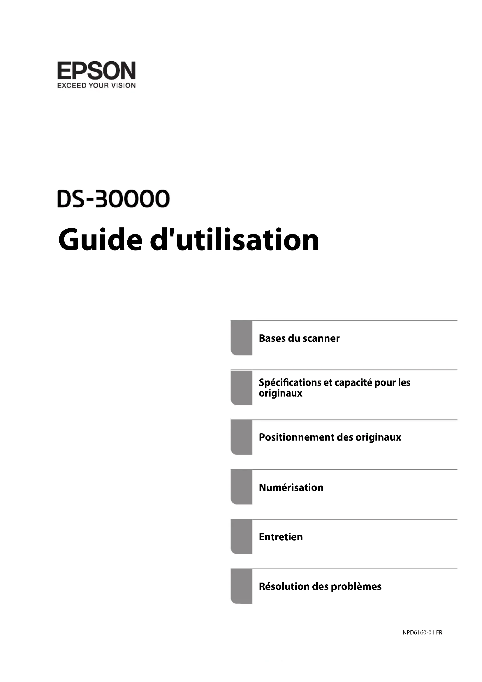 Guide d'utilisation Bases du scanner Spécications et capacité pour les originaux Positionnement des originaux Numérisation Entretien Résolution des problèmes NPD6160-01 FRCopyright Aucune partie de cette publication ne peut être reproduite, stockée dans un système de système de récupération de données, ni transmise, sous quelque forme que ce soit ni par aucun procédé électronique ou mécanique, y compris la photocopie, l'enregistrement ou autrement, sans le consentement écrit préalable de Seiko Epson Corporation. Aucune responsabilité ne sera engagée relative à l'utilisation des informations contenues dans ce manuel. Aucune responsabilité n'est assumée pour les dommages résultant des informations contenues dans ce manuel. L'information contenue dans la présente ne peut être utilisée qu'avec ce produit Epson. Epson décline toute responsabilité de l’utilisation de ces informations appliquées à d'autres produits. Neither Seiko Epson Corporation et ses liales ne peuvent être tenus responsables par l'acheteur de ce produit ou des tiers de tout dommage, perte, coût ou dépense encourus par l'acheteur ou des tiers à la suite d'un accident, d’une mauvaise utilisation, d’un abus ou des modications, réparations ou altérations non autorisées de ce produit, ou (sauf aux États-Unis) le non-respect strict des instructions d'exploitation et de maintenance de Seiko Epson Corporation. Seiko Epson Corporation et ses liales ne peuvent être tenus responsables des dommages ou des problèmes découlant de l'utilisation d'options ou de consommables autres que ceux désignés comme des produits Epson authentiques approuvés par Seiko Epson Corporation. Seiko Epson Corporation ne pourra être tenu pour responsable des dommages résultant des interférences électromagnétiques dues à l'utilisation de câbles d'interface autres que ceux désignés comme produits Epson approuvés par Seiko Epson Corporation. © 2019 Seiko Epson Corporation Le contenu de ce manuel et les caractéristiques de ce produit sont modiables sans préavis.Marques commerciales ❏ EPSON, EPSON EXCEED YOUR VISION, EXCEED YOUR VISION et leurs logos sont des marques ou des marques déposées de Seiko Epson.