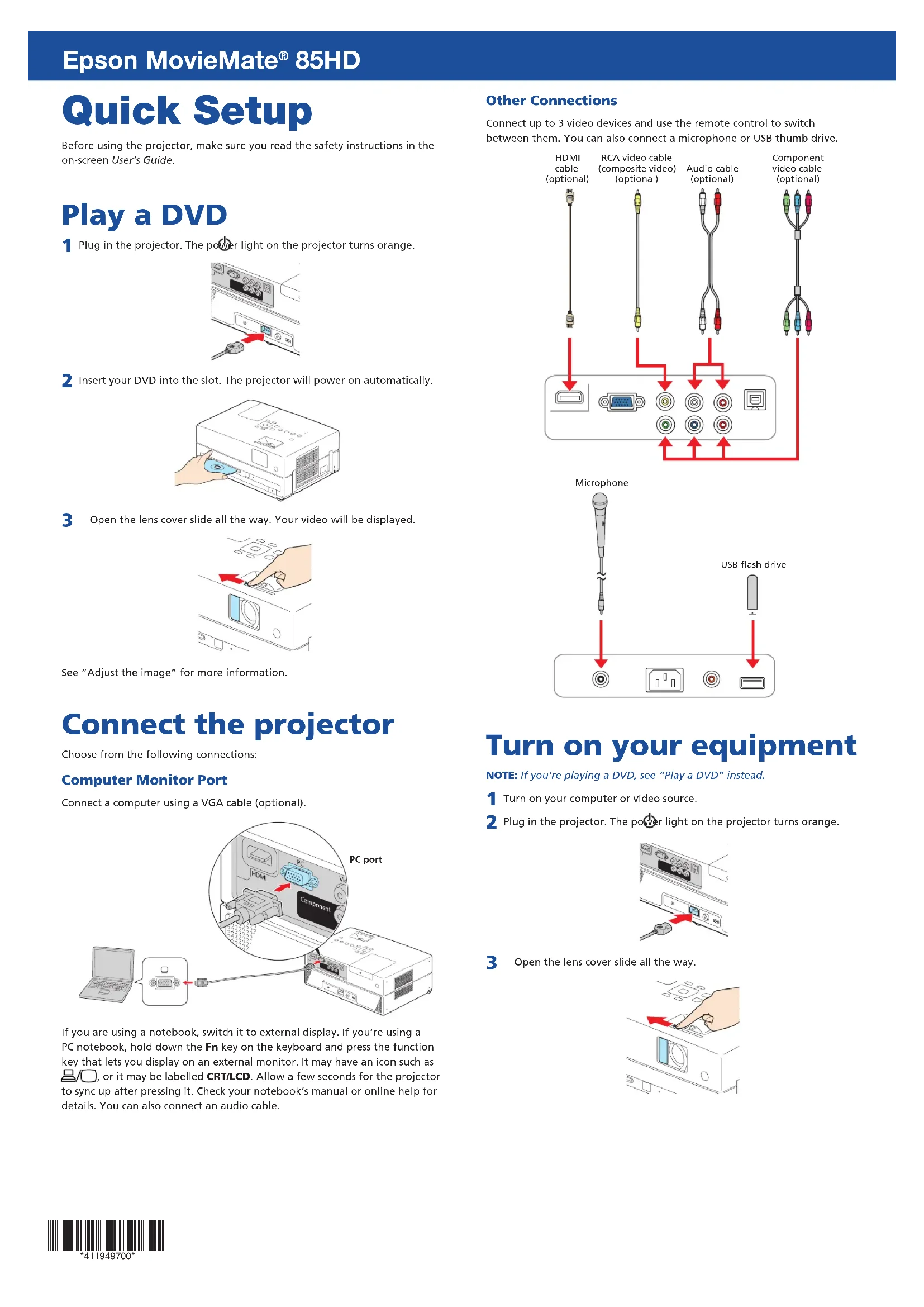 85HD Epson est une marque déposée et Epson Exceed Your Vision est un logo déposé de Seiko Epson Corporation. Epson MovieMate et PrivateLine sont des marques déposées d‘Epson America, Inc. Avis général : Les autres noms de produit figurant dans le présent document ne sont cités qu‘à titre d‘identification et peuvent être des marques de commerce de leurs propriétaires respectifs. Epson renonce à tous les droits associés à ces marques. L’information contenue dans le présent document peut être modifiée sans préavis. © 2010 Epson America, Inc. 7/10 Pays d‘impression : XXXXXXInstallation rapide Avant d‘utiliser le projecteur, assurez-vous de lire les instructions de sécurité dans le Guide de l‘utilisateur électronique de votre projecteur. Lecture d‘un DVD