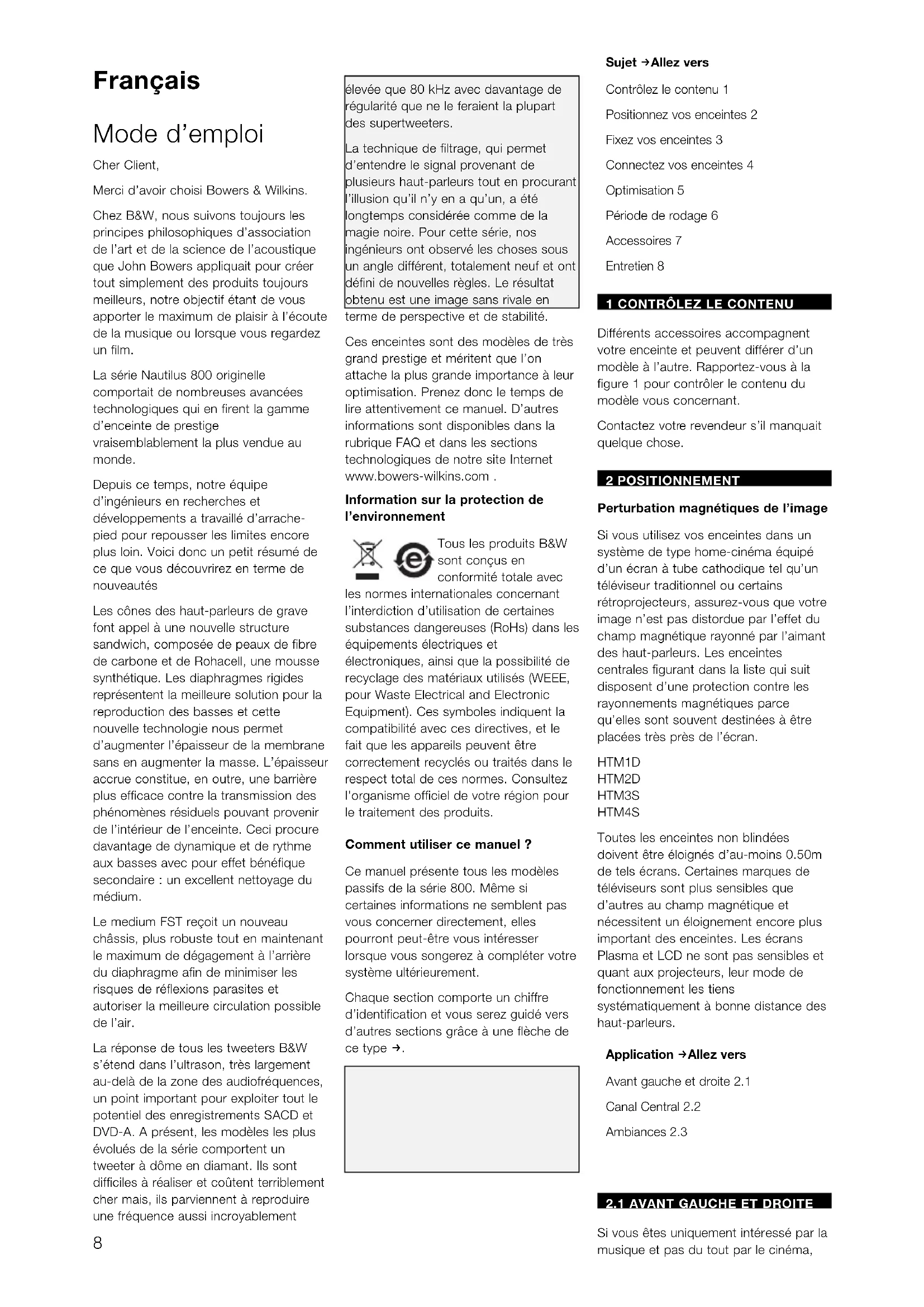 Avoid touching the drive unit diaphragms, especially the tweeter, as damage may result. Due to the delicate nature of tweeter domes, we strongly recommend that you do not attempt to remove tweeter grilles. Limited Warranty This product has been designed and manufactured to the highest quality standards. However, if something does go wrong with this product, B&W Group Ltd. and its national distributors warrant free of charge labour (exclusion may apply) and replacement parts in any country served by an official B&W distributor. This limited warranty is valid for a period of five years from the date of purchase or two years for electronics including amplified loudspeakers. Terms and Conditions 1 The warranty is limited to the repair of the equipment. Neither transportation, nor any other costs, nor any risk for removal, transportation and installation of products is covered by this warranty. 2 This warranty is only valid for the original owner. It is not transferable. 3 This warranty will not be applicable in cases other than defects in materials and/or workmanship at the time of purchase and will not be applicable: a for damages caused by incorrect installation, connection or packing, b for damages caused by any use other than correct use described in the user manual, negligence, modifications, or use of parts that are not made or authorised by B&W, c for damages caused by faulty or unsuitable ancillary equipment, d for damages caused by accidents, lightning, water, fire heat, war, public disturbances or any other cause beyond the reasonable control of B&W and its appointed distributors, e for products whose serial number has been altered, deleted, removed or made illegible, f if repairs or modifications have been executed by an unauthorised person. 4 This guarantee complements any national/regional law obligations of dealers or national distributors and does not affect your statutory rights as a customer. How to claim repairs under warranty Should service be r equir ed, please follow the following procedure: 1 If the equipment is being used in the country of pur chase, you should contact the B&W authorised dealer from whom the equipment was purchased. 2 If the equipment is being used outside the country of purchase, you should contact the B&W national distributor in the country of residence who will advise where the equipment can be serviced. You can call B&W in the UK or visit our web site to get the contact details of your local distributor. To validate any claim under the warranty, you will need to produce the original sales invoice or other proof of ownership and date of purchase.8 Français Mode d’emploi Cher Client, Merci d’avoir choisi Bowers & Wilkins. Chez B&W, nous suivons toujours les principes philosophiques d’association de l’art et de la science de l’acoustique que John Bowers appliquait pour créer tout simplement des produits toujours meilleurs, notre objectif étant de vous apporter le maximum de plaisir à l’écoute de la musique ou lorsque vous regardez un film. La série Nautilus 800 originelle comportait de nombreuses avancées technologiques qui en firent la gamme d’enceinte de pr estige vraisemblablement la plus vendue au monde. Depuis ce temps, notre équipe d’ingénieurs en recherches et développements a travaillé d’arrache- pied pour repousser les limites encore plus loin. Voici donc un petit résumé de ce que vous découvrirez en terme de nouveautés Les cônes des haut-parleurs de grave font appel à une nouvelle structure sandwich, composée de peaux de fibre de carbone et de Rohacell, une mousse synthétique. Les diaphragmes rigides représentent la meilleure solution pour la reproduction des basses et cette nouvelle technologie nous permet d’augmenter l’épaisseur de la membrane sans en augmenter la masse. L’épaisseur accrue constitue, en outre, une barrière plus efficace contre la transmission des phénomènes résiduels pouvant provenir de l’intérieur de l’enceinte. Ceci procure davantage de dynamique et de rythme aux basses avec pour effet bénéfique secondaire : un excellent nettoyage du médium. Le medium FST reçoit un nouveau châssis, plus robuste tout en maintenant le maximum de dégagement à l’arrière du diaphragme afin de minimiser les risques de réflexions parasites et autoriser la meilleure circulation possible de l’air. La réponse de tous les tweeters B&W s’étend dans l’ultrason, très largement au-delà de la zone des audiofréquences, un point important pour exploiter tout le potentiel des enregistrements SACD et DVD-A. A présent, les modèles les plus évolués de la série comportent un tweeter à dôme en diamant. Ils sont difficiles à réaliser et coûtent terriblement cher mais, ils parviennent à reproduire une fréquence aussi incroyablement élevée que 80 kHz avec davantage de régularité que ne le feraient la plupart des supertweeters. La technique de filtrage, qui permet d’entendre le signal provenant de plusieurs haut-parleurs tout en procurant l’illusion qu’il n’y en a qu’un, a été longtemps considérée comme de la magie noire. Pour cette série, nos ingénieurs ont observé les choses sous un angle différent, totalement neuf et ont défini de nouvelles règles. Le résultat obtenu est une image sans rivale en terme de perspective et de stabilité. Ces enceintes sont des modèles de très grand prestige et méritent que l’on attache la plus grande importance à leur optimisation. Prenez donc le temps de lire attentivement ce manuel. D’autres informations sont disponibles dans la rubrique FAQ et dans les sections technologiques de notre site Internet www.bowers-wilkins.com . Information sur la protection de l’environnement Tous les produits B&W sont conçus en conformité totale avec les normes internationales concernant l’interdiction d’utilisation de certaines substances dangereuses (RoHs) dans les équipements électriques et électroniques, ainsi que l